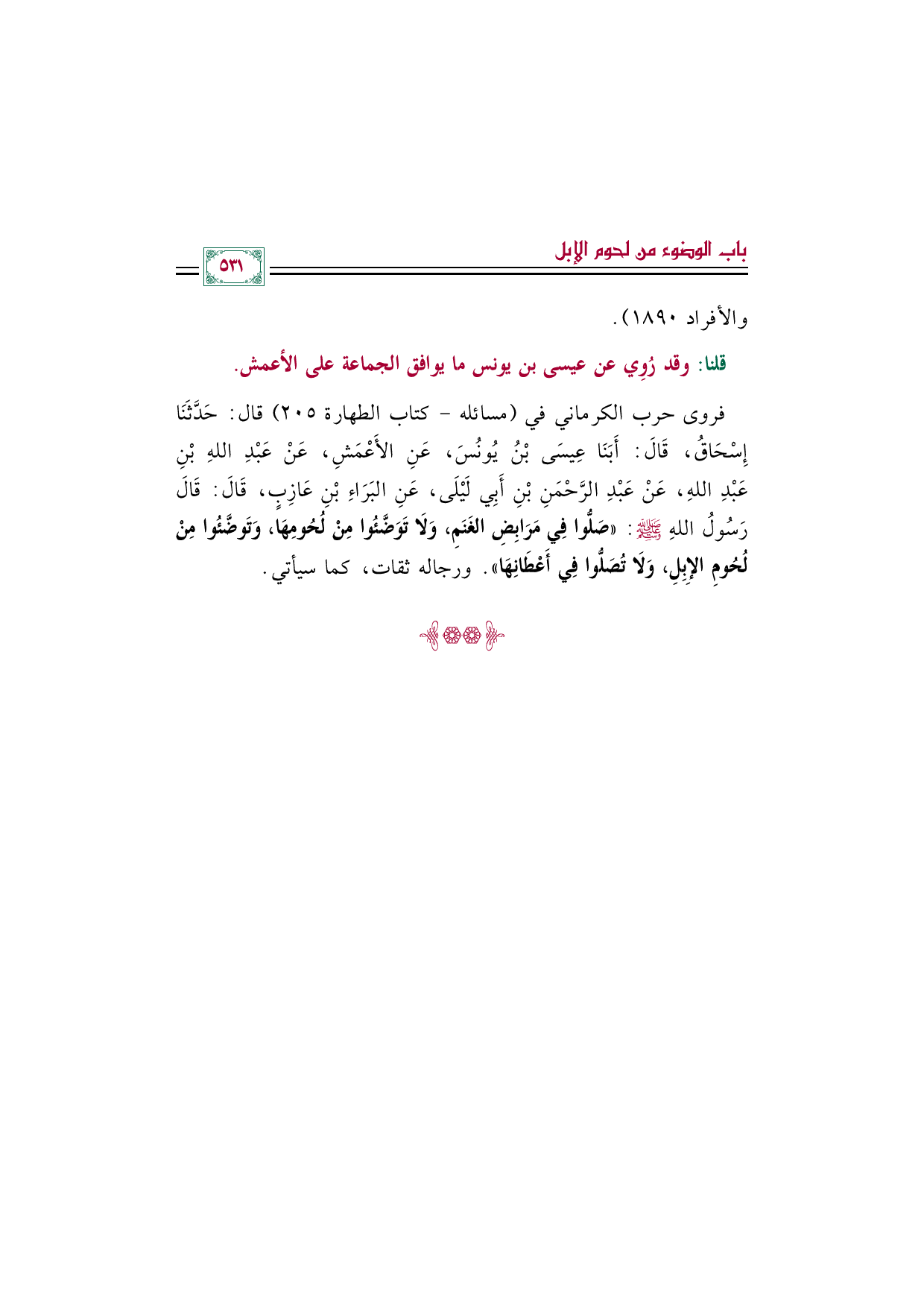 فروى حرب الكرماني في (مسائله-كتاب الطهارة ٢٠٥) قال: حَدَّثَنَا إِسْحَاقُ، قَالَ: أَبَنَا عِيسَى بْنُ يُونُسَ، عَنِ الأَعْمَشِ، عَنْ عَبْدِ اللهِ بْنِ عَبْدِ اللهِ، عَنْ عَبْدِ الرَّحْمَنِ بْنِ أَبِي لَيْلَى، عَنِ البَرَاءِ بْنِ عَازِبٍ، قَالَ: قَالَ رَسُولُ اللهِ صَلَّى اللهُ عَلَيْهِ وَسَلَّمَ: «صَلُّوا فِي مَرَابِضِ الغَنَمِ، وَلَا تَوَضَّئُوا مِنْ لُحُومِهَا، وَتَوضَّئُوا مِنْ لُحُومِ الإِبِلِ، وَلَا تُصَلُّوا فِي أَعْطَانِهَا». ورجاله ثقات، كما سيأتي.