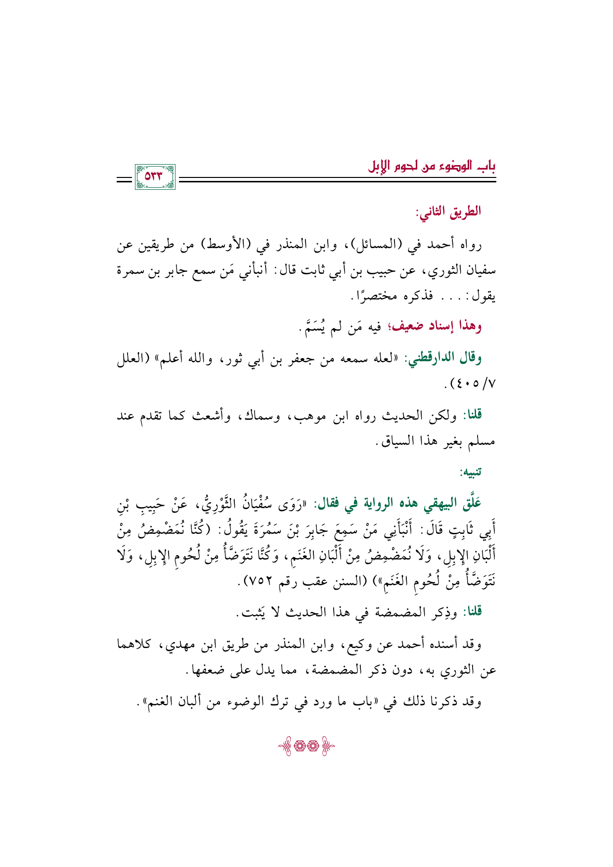 عَلَّق البيهقي هذه الرواية في فقال: ((رَوَى سُفْيَانُ الثَّوْرِيُّ، عَنْ حَبِيبِ بْنِ أَبِي ثَابِتٍ قَالَ: أَنْبَأَنِي مَنْ سَمِعَ جَابِرَ بْنَ سَمُرَةَ يَقُولُ: (كُنَّا نُمَضْمِضُ مِنْ أَلْبَانِ الإِبِلِ، وَلَا نُمَضْمِضُ مِنْ أَلْبَانِ الغَنَمِ، وَكُنَّا نَتَوَضَّأُ مِنْ لُحُومِ الإِبِلِ، وَلَا نَتَوَضَّأُ مِنْ لُحُومِ الغَنَمِ))) (السنن عقب رقم ٧٥٢).