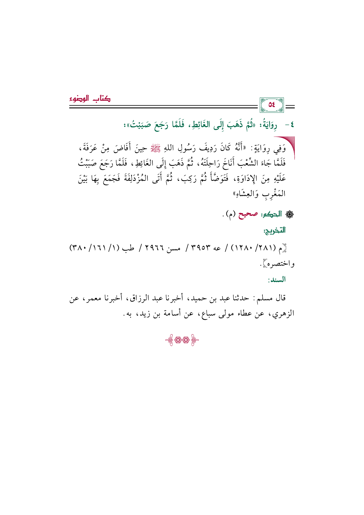 • وَفِي رِوَايَةٍ: ((أَنَّهُ كَانَ رَدِيفَ رَسُولِ اللهِ صَلَّى اللهُ عَلَيْهِ وَسَلَّمَ حِينَ أَفَاضَ مِنْ عَرَفَةَ، فَلَمَّا جَاءَ الشِّعْبَ أَنَاخَ رَاحِلَتَهُ، ثُمَّ ذَهَبَ إِلَى الغَائِطِ، فَلَمَّا رَجَعَ صَبَبْتُ عَلَيْهِ مِنَ الإِدَاوَةِ، فَتَوَضَّأَ ثُمَّ رَكِبَ، ثُمَّ أَتَى المُزْدَلِفَةَ فَجَمَعَ بِهَا بَيْنَ المَغْرِبِ وَالعِشَاءِ))