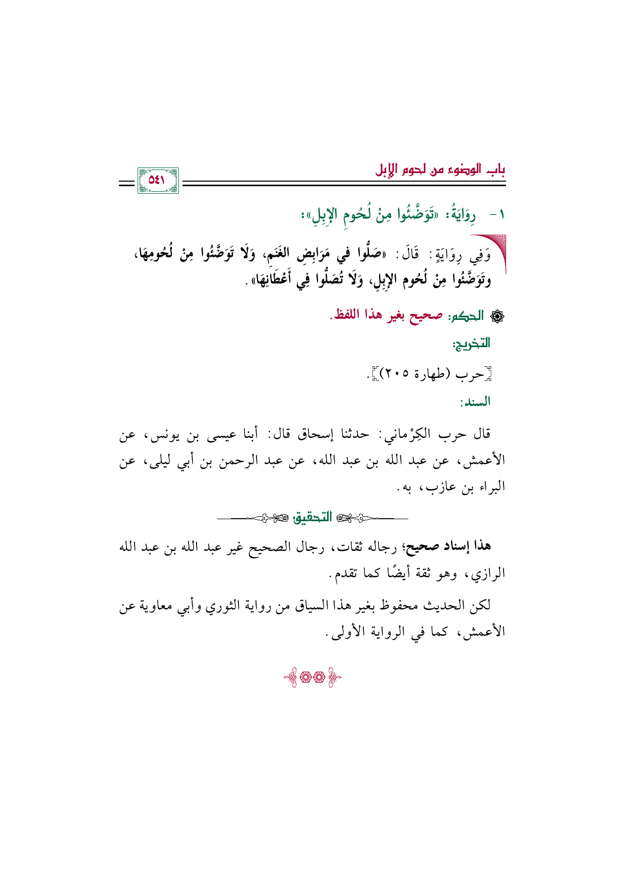قال حرب الكِرْماني: حدثنا إسحاق قال: أبنا عيسى بن يونس، عن الأعمش، عن عبد الله بن عبد الله، عن عبد الرحمن بن أبي ليلى، عن البراء بن عازب، به.