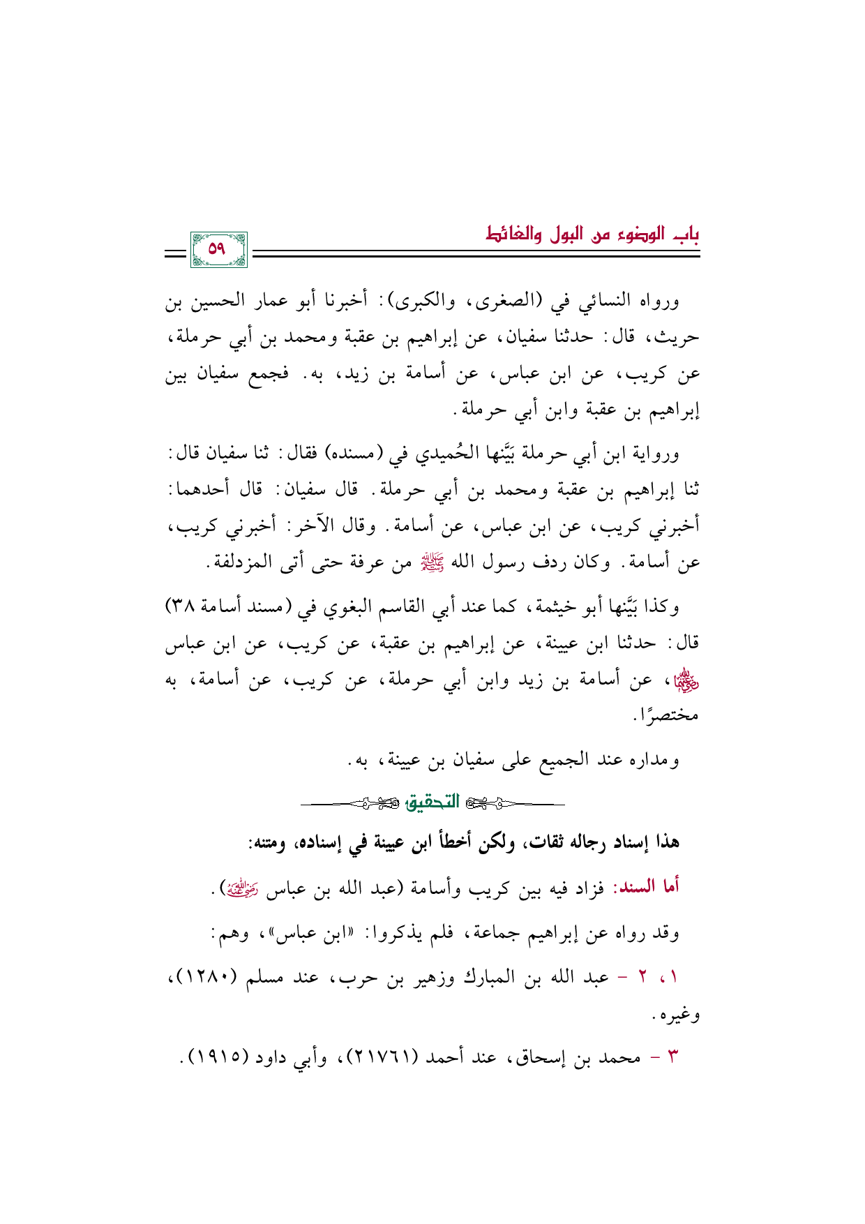 ورواه النسائي في (الصغرى، والكبرى): أخبرنا أبو عمار الحسين بن حريث، قال: حدثنا سفيان، عن إبراهيم بن عقبة ومحمد بن أبي حرملة، عن كريب، عن ابن عباس، عن أسامة بن زيد، به. فجمع سفيان بين إبراهيم بن عقبة وابن أبي حرملة.