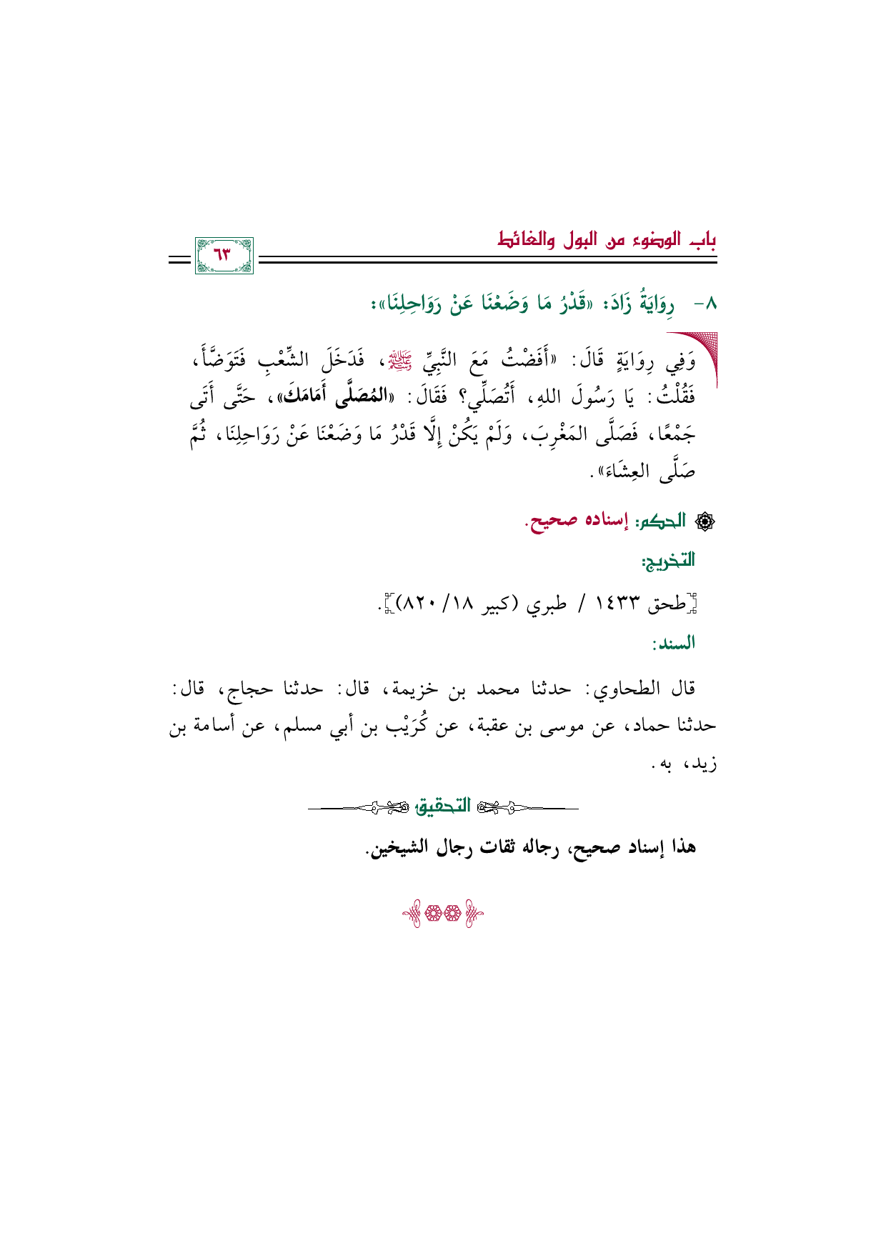 قال الطحاوي: حدثنا محمد بن خزيمة، قال: حدثنا حجاج، قال: حدثنا حماد، عن موسى بن عقبة، عن كُرَيْب بن أبي مسلم، عن أسامة بن زيد، به.