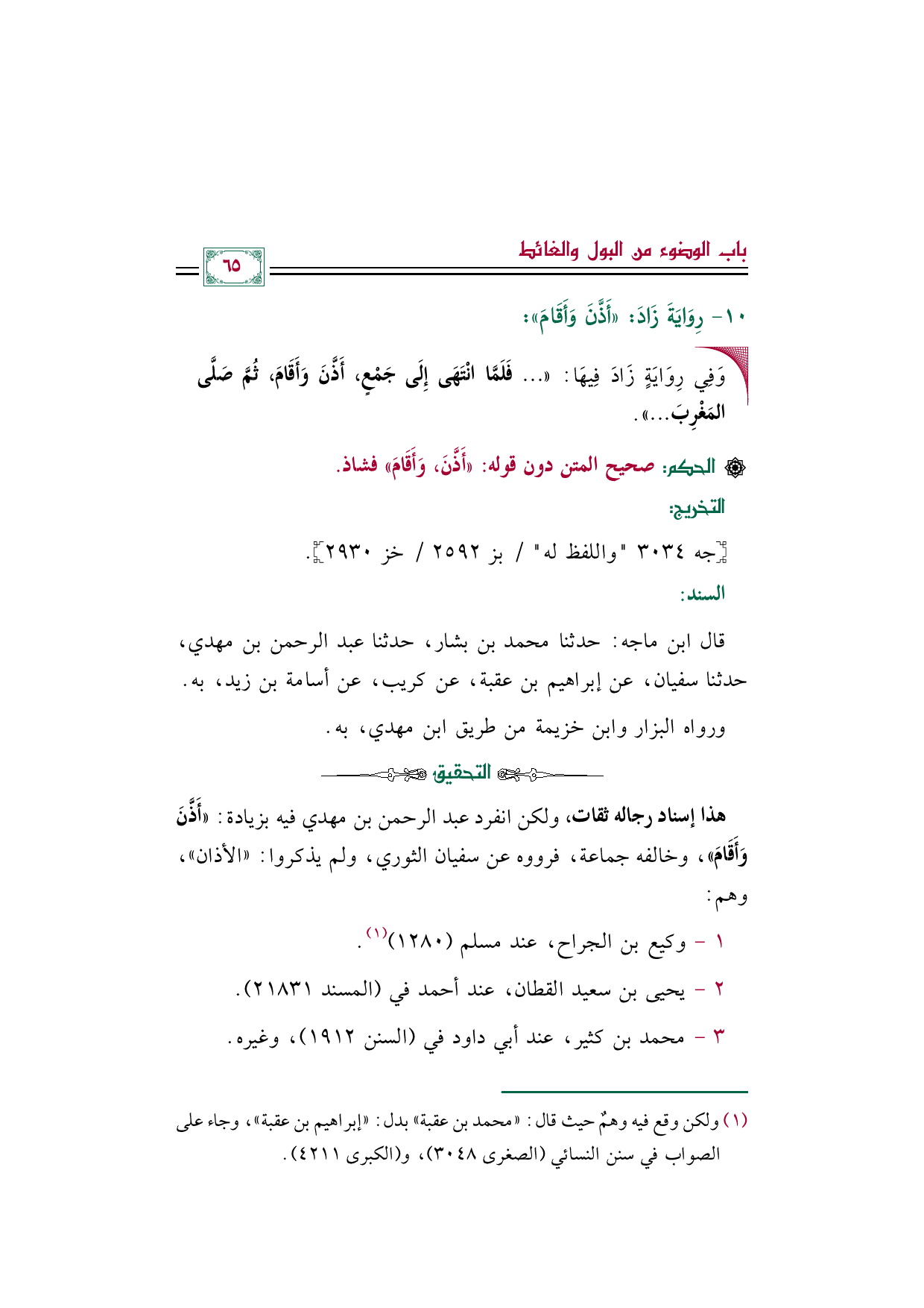 هذا إسناد رجاله ثقات، ولكن انفرد عبد الرحمن بن مهدي فيه بزيادة: ((أَذَّنَ وَأَقَامَ))، وخالفه جماعة، فرووه عن سفيان الثوري، ولم يذكروا: ((الأذان))، وهم: