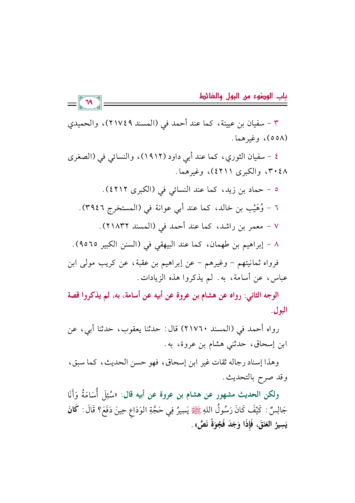 الوجه الثاني: رواه عن هشام بن عروة عن أبيه عن أسامة، به، لم يذكروا قصة البول.