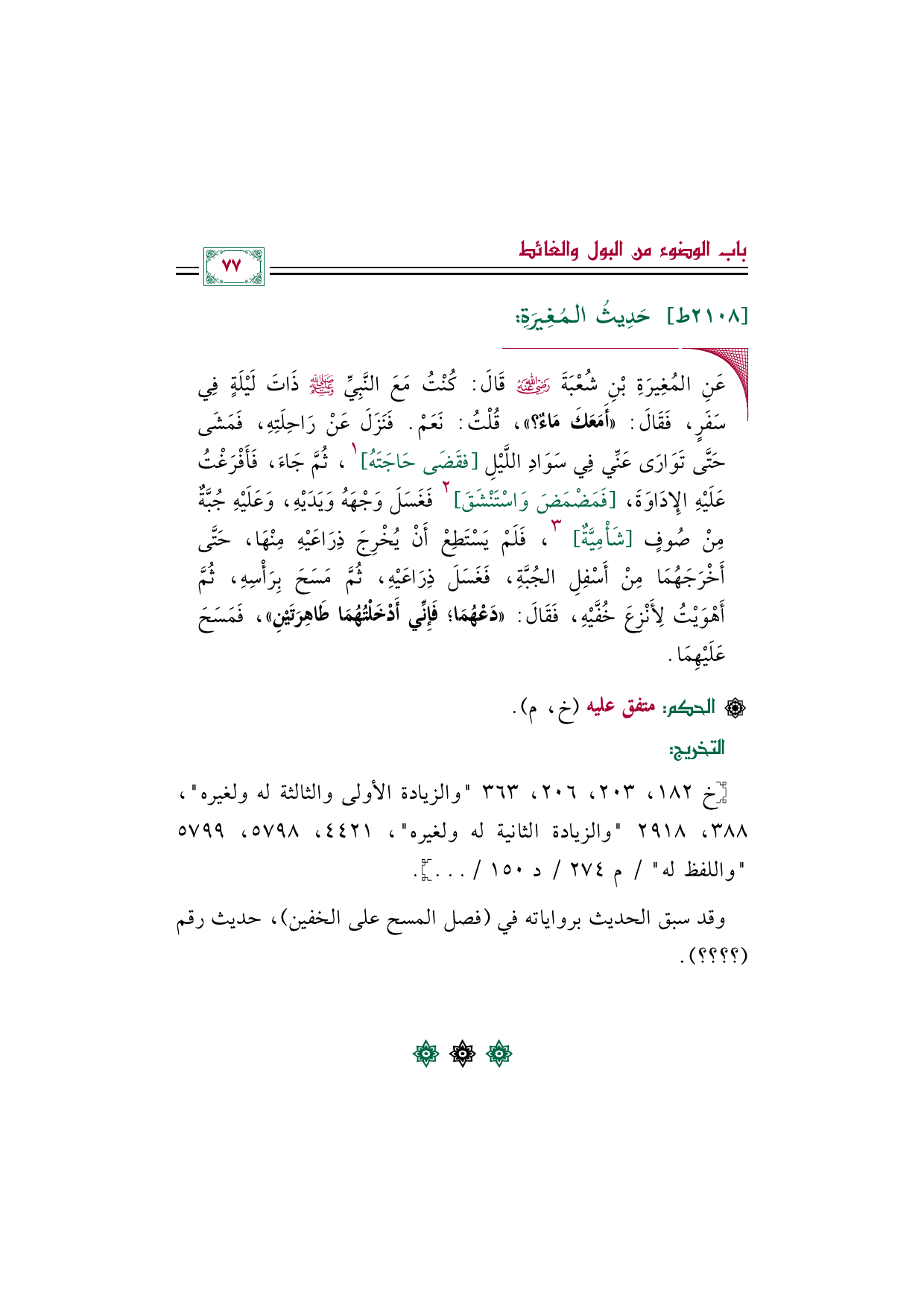 ◼ عَنِ المُغِيرَةِ بْنِ شُعْبَةَ رضي الله عنه قَالَ: كُنْتُ مَعَ النَّبِيِّ صَلَّى اللهُ عَلَيْهِ وَسَلَّمَ ذَاتَ لَيْلَةٍ فِي سَفَرٍ، فَقَالَ: ((أَمَعَكَ مَاءٌ؟ ))، قُلْتُ: نَعَمْ. فَنَزَلَ عَنْ رَاحِلَتِهِ، فَمَشَى حَتَّى تَوَارَى عَنِّي فِي سَوَادِ اللَّيْلِ [فقَضَى حَاجَتَهُ] ١، ثُمَّ جَاءَ، فَأَفْرَغْتُ عَلَيْهِ الإِدَاوَةَ، [فَمَضْمَضَ وَاسْتَنْشَقَ] ٢ فَغَسَلَ وَجْهَهُ وَيَدَيْهِ، وَعَلَيْهِ جُبَّةٌ مِنْ صُوفٍ [شَأْمِيَّةٌ] ٣، فَلَمْ يَسْتَطِعْ أَنْ يُخْرِجَ ذِرَاعَيْهِ مِنْهَا، حَتَّى أَخْرَجَهُمَا مِنْ أَسْفِلِ الجُبَّةِ، فَغَسَلَ ذِرَاعَيْهِ، ثُمَّ مَسَحَ بِرَأْسِهِ، ثُمَّ أَهْوَيْتُ لِأَنْزِعَ خُفَّيْهِ، فَقَالَ: ((دَعْهُمَا؛ فَإِنِّي أَدْخَلْتُهُمَا طَاهِرَتَيْنِ))، فَمَسَحَ عَلَيْهِمَا.