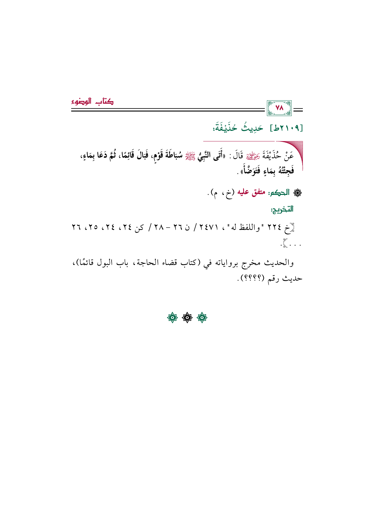 ◼ عَنْ حُذَيْفَةَ رَضِيَ اللهُ عَنْهُ قَالَ: «أَتَى النَّبِيُّ صَلَّى اللهُ عَلَيْهِ وَسَلَّمَ سُبَاطَةَ قَوْمٍ، فَبَالَ قَائِمًا، ثُمَّ دَعَا بِمَاءٍ، فَجِئْتُهُ بِمَاءٍ فَتَوَضَّأَ».