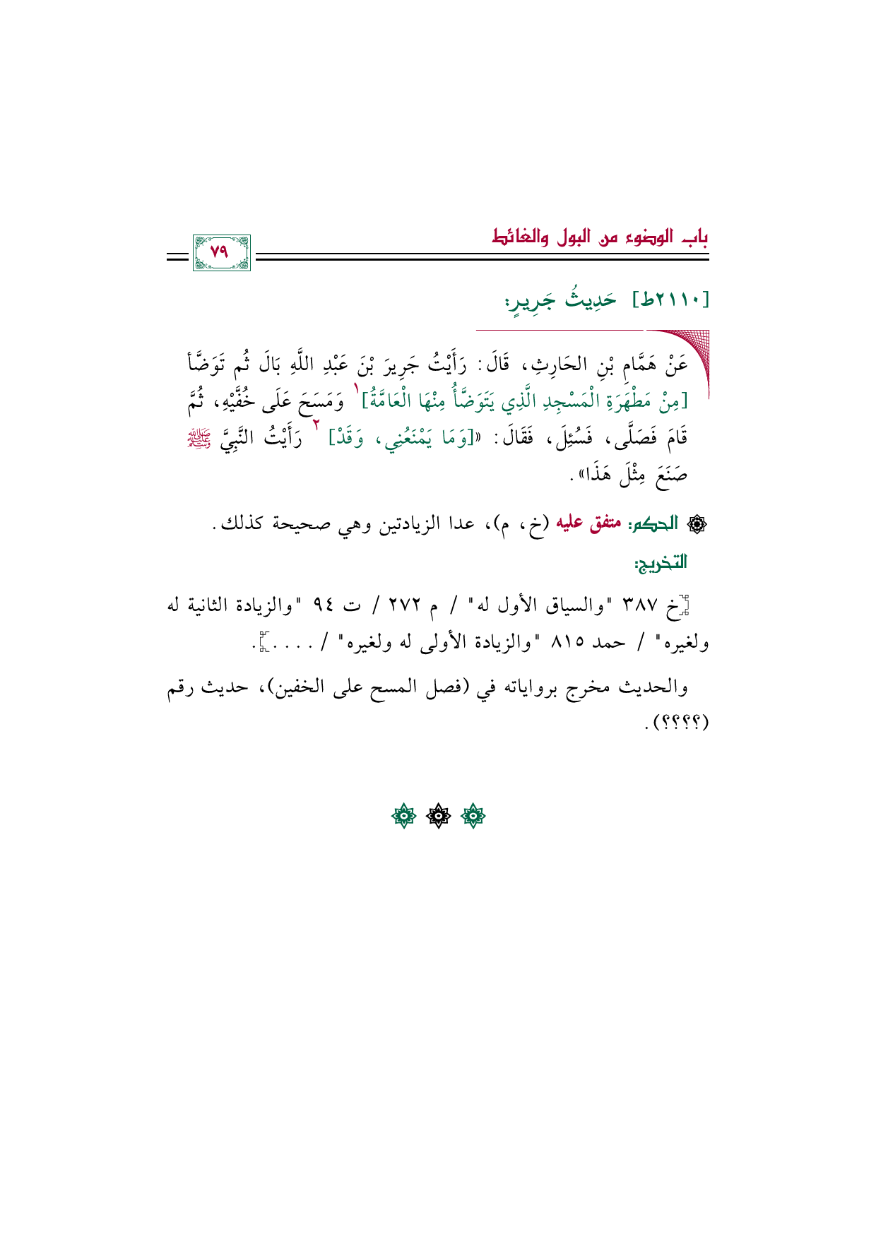 والحديث مخرج برواياته في (فصل المسح على الخفين)، حديث رقم (؟ ؟ ؟ ؟ ).