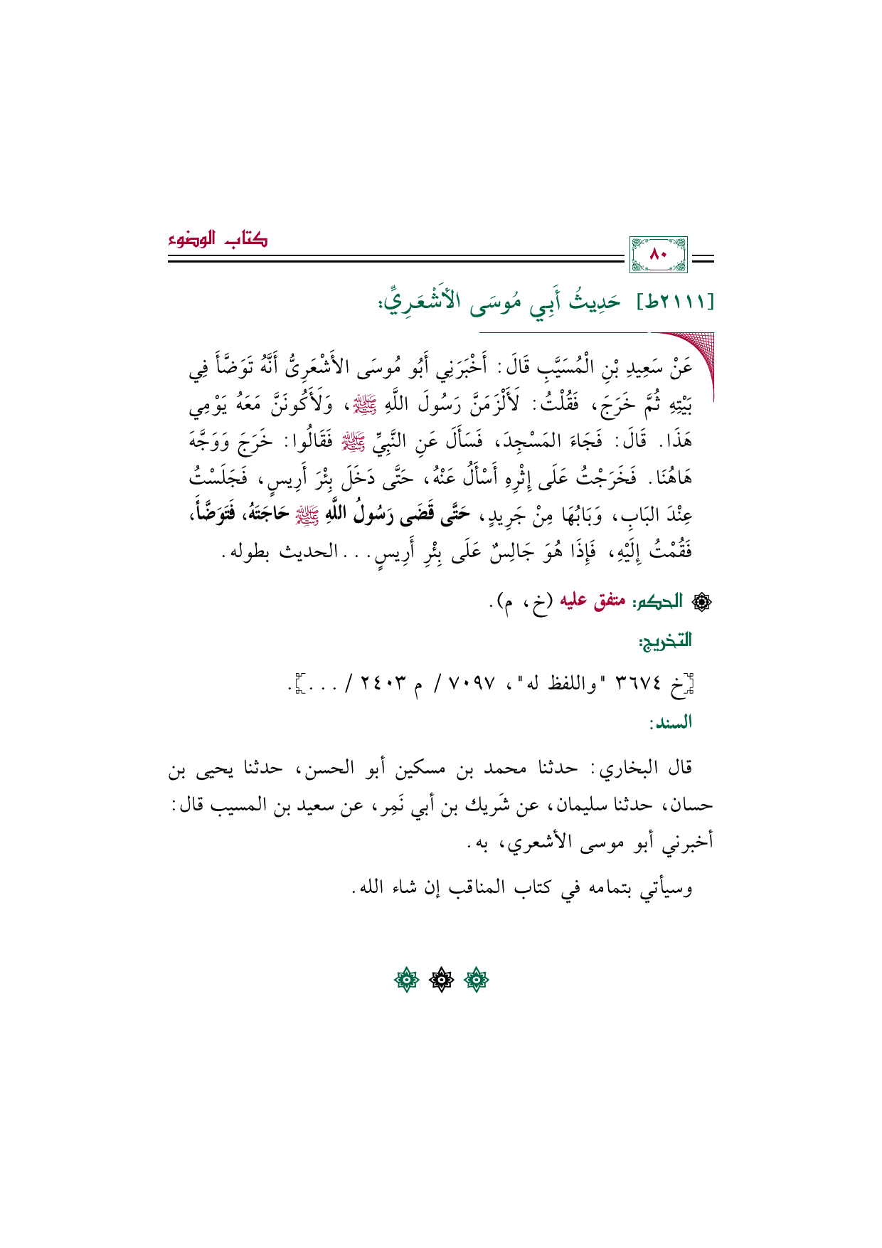 ◼ عَنْ سَعِيدِ بْنِ الْمُسَيَّبِ قَالَ: أَخْبَرَنِي أَبُو مُوسَى الأَشْعَرِىُّ أَنَّهُ تَوَضَّأَ فِي بَيْتِهِ ثُمَّ خَرَجَ، فَقُلْتُ: لَأَلْزَمَنَّ رَسُولَ اللَّهِ صَلَّى اللهُ عَلَيْهِ وَسَلَّمَ، وَلَأَكُونَنَّ مَعَهُ يَوْمِي هَذَا. قَالَ: فَجَاءَ المَسْجِدَ، فَسَأَلَ عَنِ النَّبِيِّ صَلَّى اللهُ عَلَيْهِ وَسَلَّمَ فَقَالُوا: خَرَجَ وَوَجَّهَ هَاهُنَا. فَخَرَجْتُ عَلَى إِثْرِهِ أَسْأَلُ عَنْهُ، حَتَّى دَخَلَ بِئْرَ أَرِيسٍ، فَجَلَسْتُ عِنْدَ البَابِ، وَبَابُهَا مِنْ جَرِيدٍ، حَتَّى قَضَى رَسُولُ اللَّهِ صَلَّى اللهُ عَلَيْهِ وَسَلَّمَ حَاجَتَهُ، فَتَوَضَّأَ، فَقُمْتُ إِلَيْهِ، فَإِذَا هُوَ جَالِسٌ عَلَى بِئْرِ أَرِيسٍ ... الحديث بطوله.