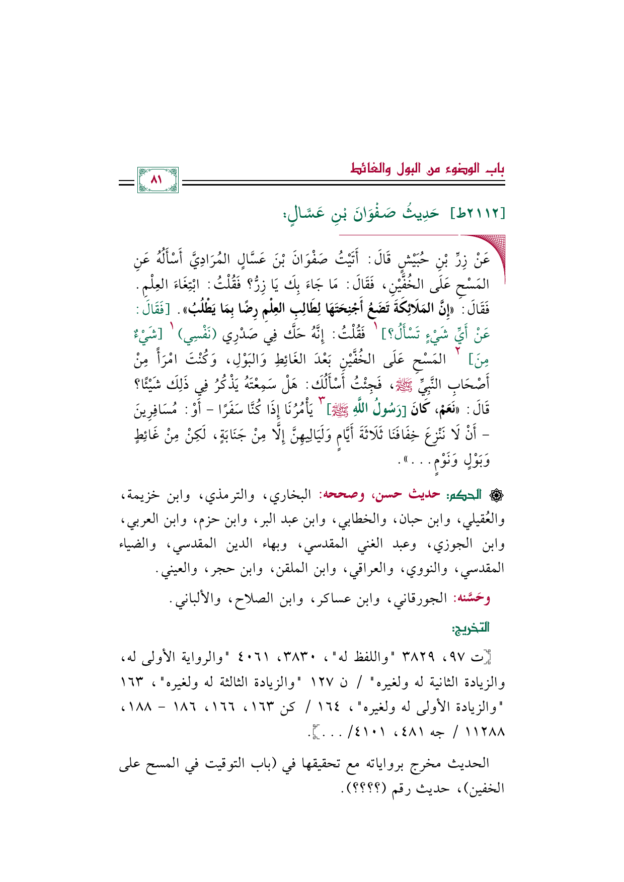 الحديث مخرج برواياته مع تحقيقها في (باب التوقيت في المسح على الخفين)، حديث رقم (؟ ؟ ؟ ؟ ).