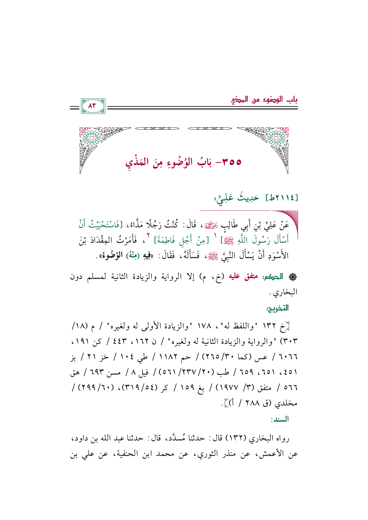 ◼ عَنْ عَلِيِّ بْنِ أَبِي طَالِبٍ رَضِيَ اللهُ عَنْهُ، قَالَ: كُنْتُ رَجُلًا مَذَّاءً، [فَاسْتَحْيَيْتُ أَنْ أَسْأَلَ رَسُولَ اللَّهِ صَلَّى اللهُ عَلَيْهِ وَسَلَّمَ] ١ [مِنْ أَجْلِ فَاطِمَةَ] ٢، فَأَمَرْتُ المِقْدَادَ بْنَ الأَسْوَدِ أَنْ يَسْأَلَ النَّبِيَّ صَلَّى اللهُ عَلَيْهِ وَسَلَّمَ، فَسَأَلَهُ، فَقَالَ: ((فِيهِ (مِنْهُ) الوُضُوءُ)).