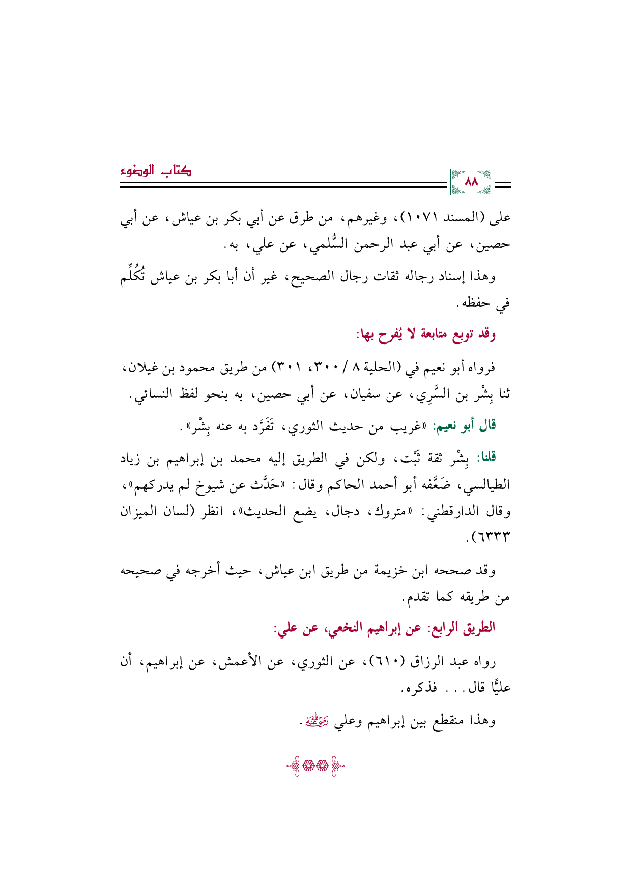 على (المسند ١٠٧١)، وغيرهم، من طرق عن أبي بكر بن عياش، عن أبي حصين، عن أبي عبد الرحمن السُّلمي، عن علي، به.