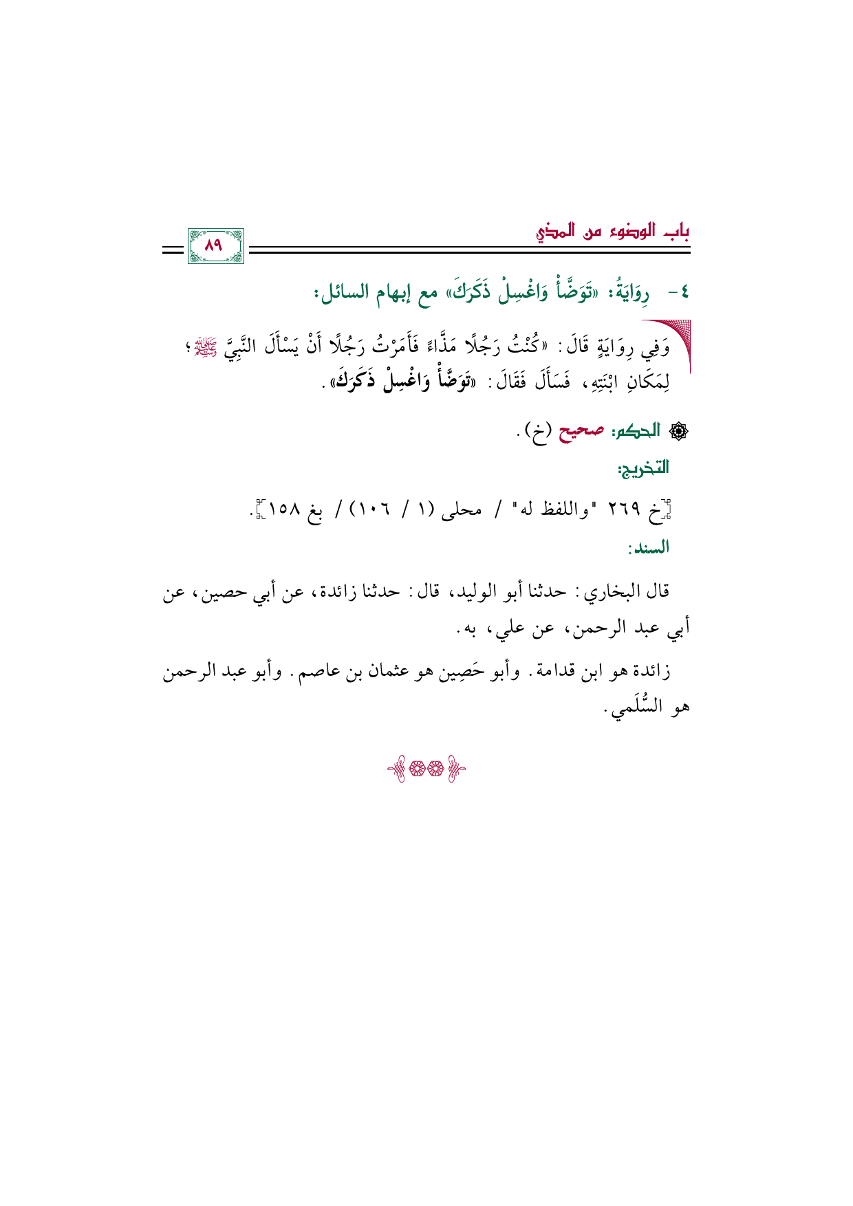 • وَفِي رِوَايَةٍ قَالَ: ((كُنْتُ رَجُلًا مَذَّاءً فَأَمَرْتُ رَجُلًا أَنْ يَسْأَلَ النَّبِيَّ صَلَّى اللهُ عَلَيْهِ وَسَلَّمَ؛ لِمَكَانِ ابْنَتِهِ، فَسَأَلَ فَقَالَ: ((تَوَضَّأْ وَاغْسِلْ ذَكَرَكَ)).
