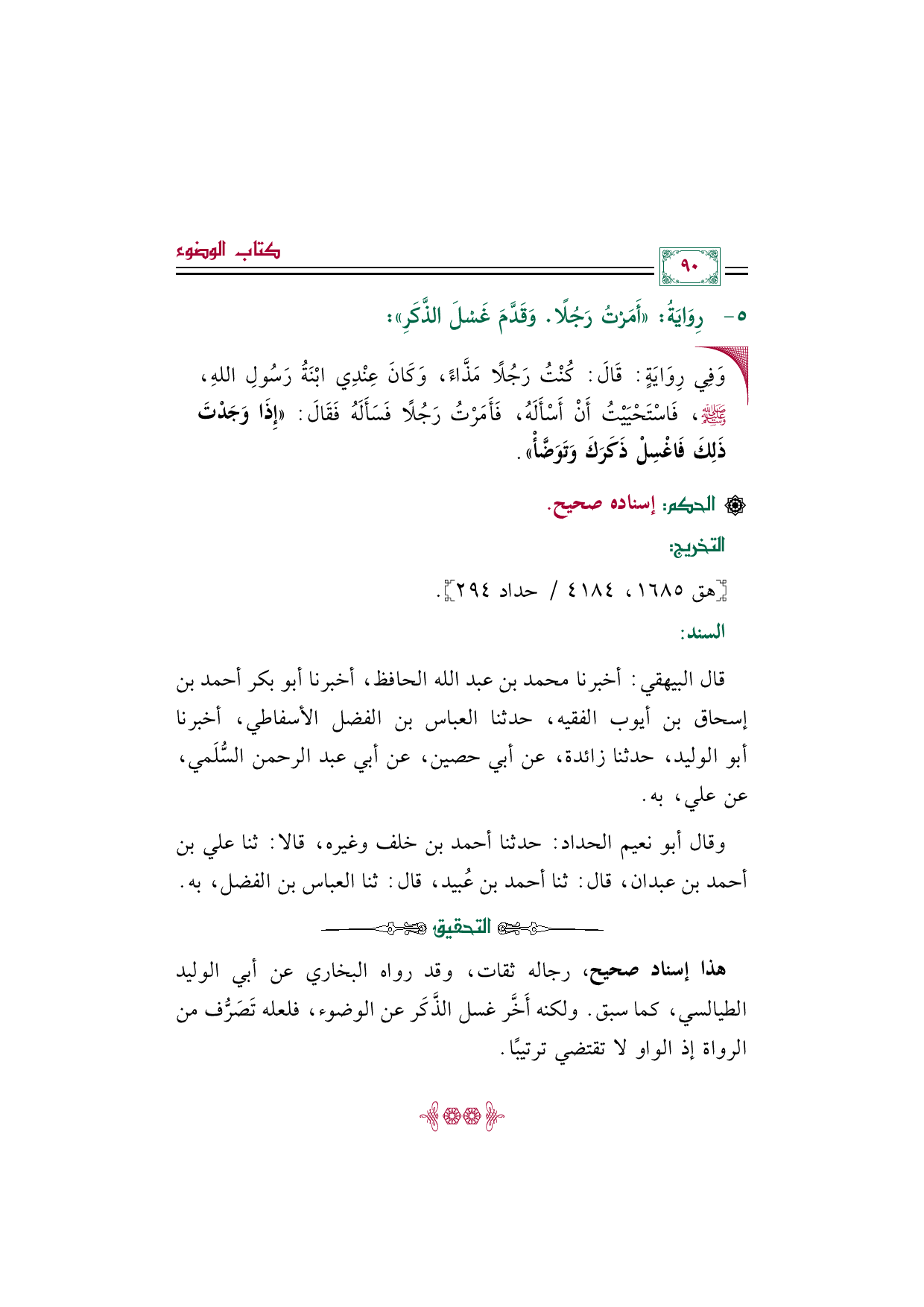 هذا إسناد صحيح، رجاله ثقات، وقد رواه البخاري عن أبي الوليد الطيالسي، كما سبق. ولكنه أَخَّر غسل الذَّكَر عن الوضوء، فلعله تَصَرُّف من الرواة إذ الواو لا تقتضي ترتيبًا.