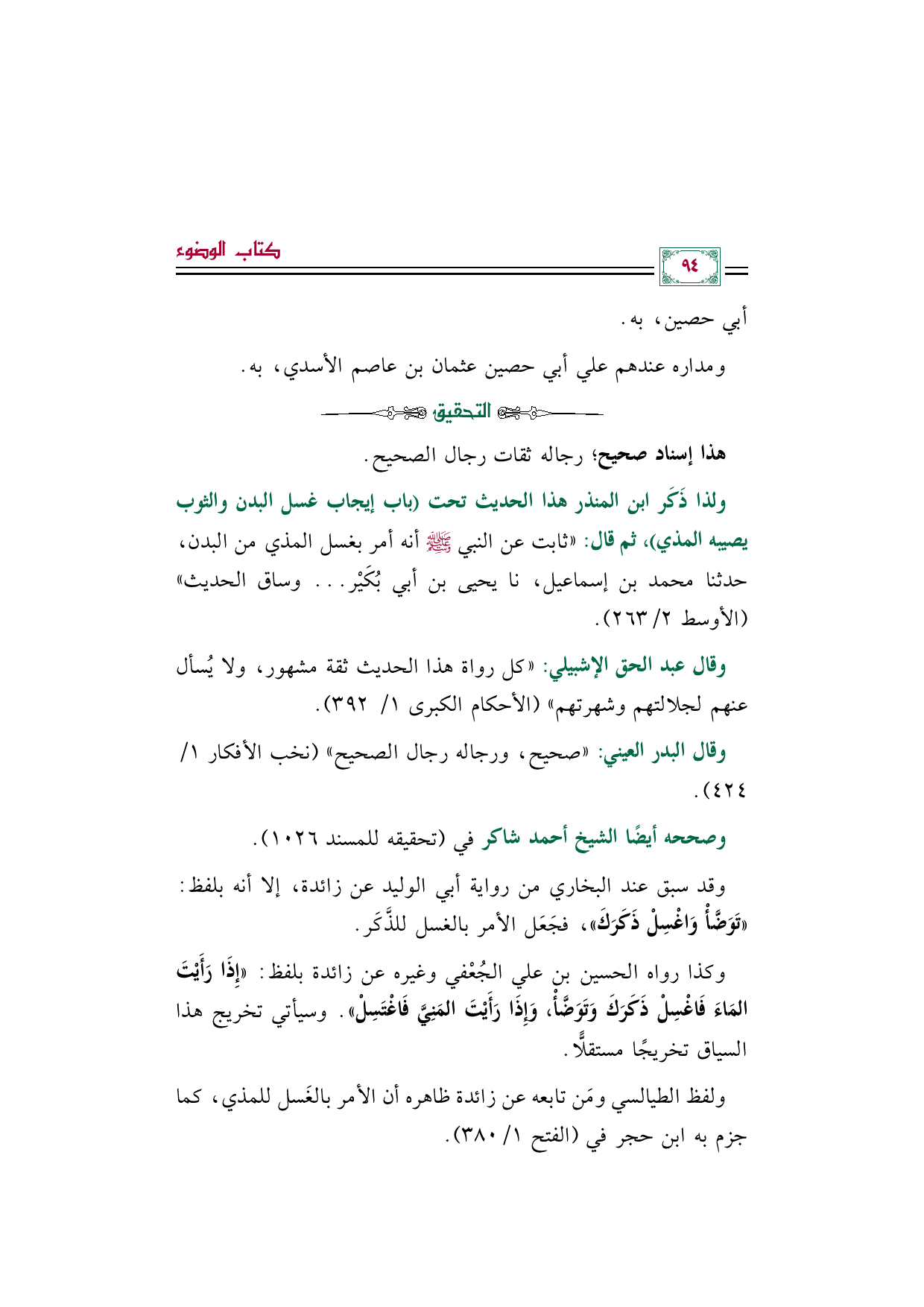 ولذا ذَكَر ابن المنذر هذا الحديث تحت (باب إيجاب غسل البدن والثوب يصيبه المذي)، ثم قال: "ثابت عن النبي صلى الله عليه وسلم أنه أمر بغسل المذي من البدن، حدثنا محمد بن إسماعيل، نا يحيى بن أبي بُكَيْر ... وساق الحديث" (الأوسط ٢/ ٢٦٣).