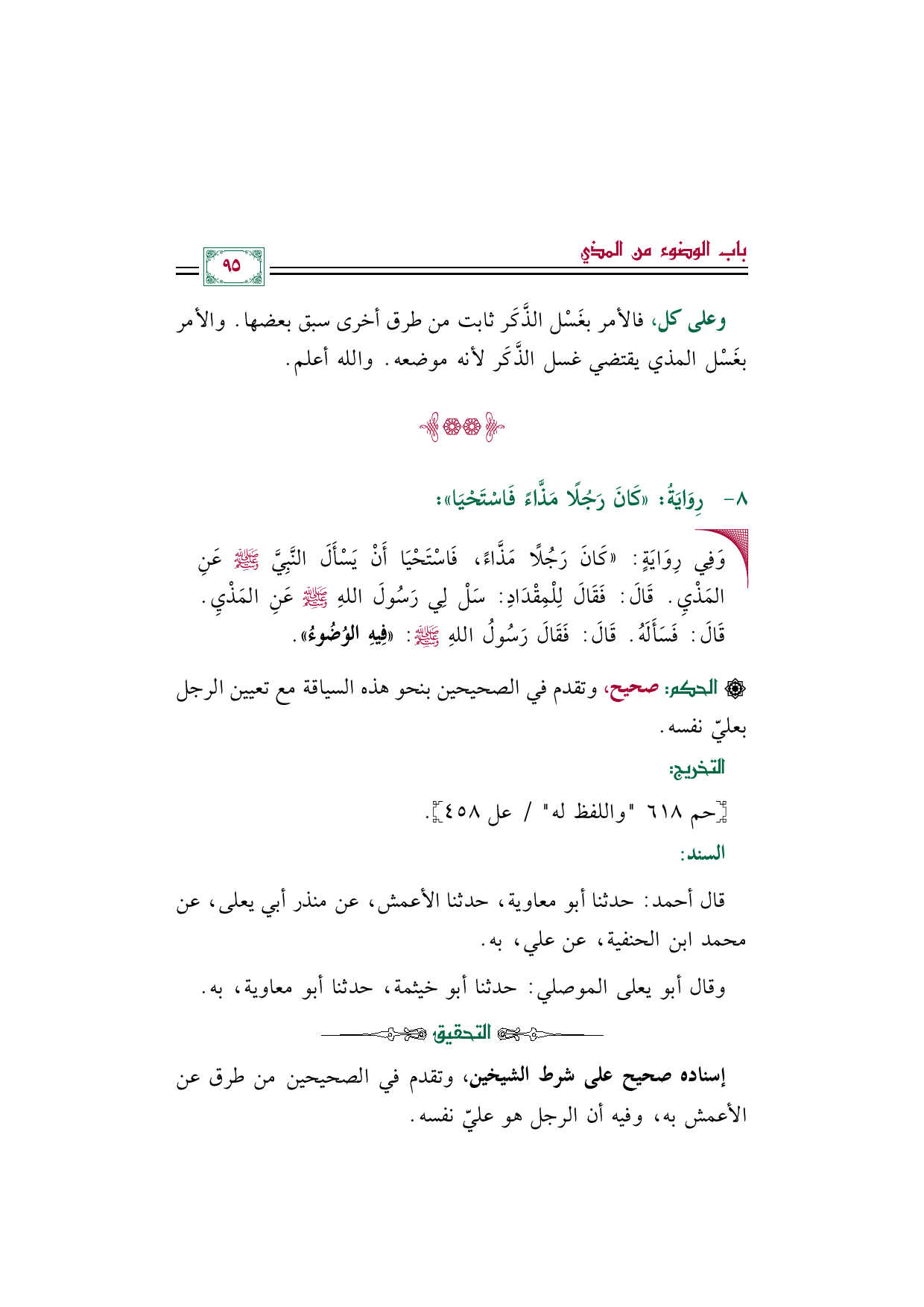 قال أحمد: حدثنا أبو معاوية، حدثنا الأعمش، عن منذر أبي يعلى، عن محمد ابن الحنفية، عن علي، به.