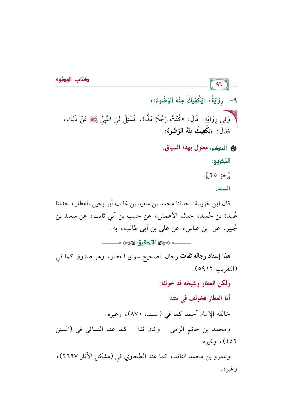 قال ابن خزيمة: حدثنا محمد بن سعيد بن غالب أبو يحيى العطار، حدثنا عُبيدة بن حُميد، حدثنا الأعمش، عن حبيب بن أبي ثابت، عن سعيد بن جُبير، عن ابن عباس، عن علي بن أبي طالب، به.