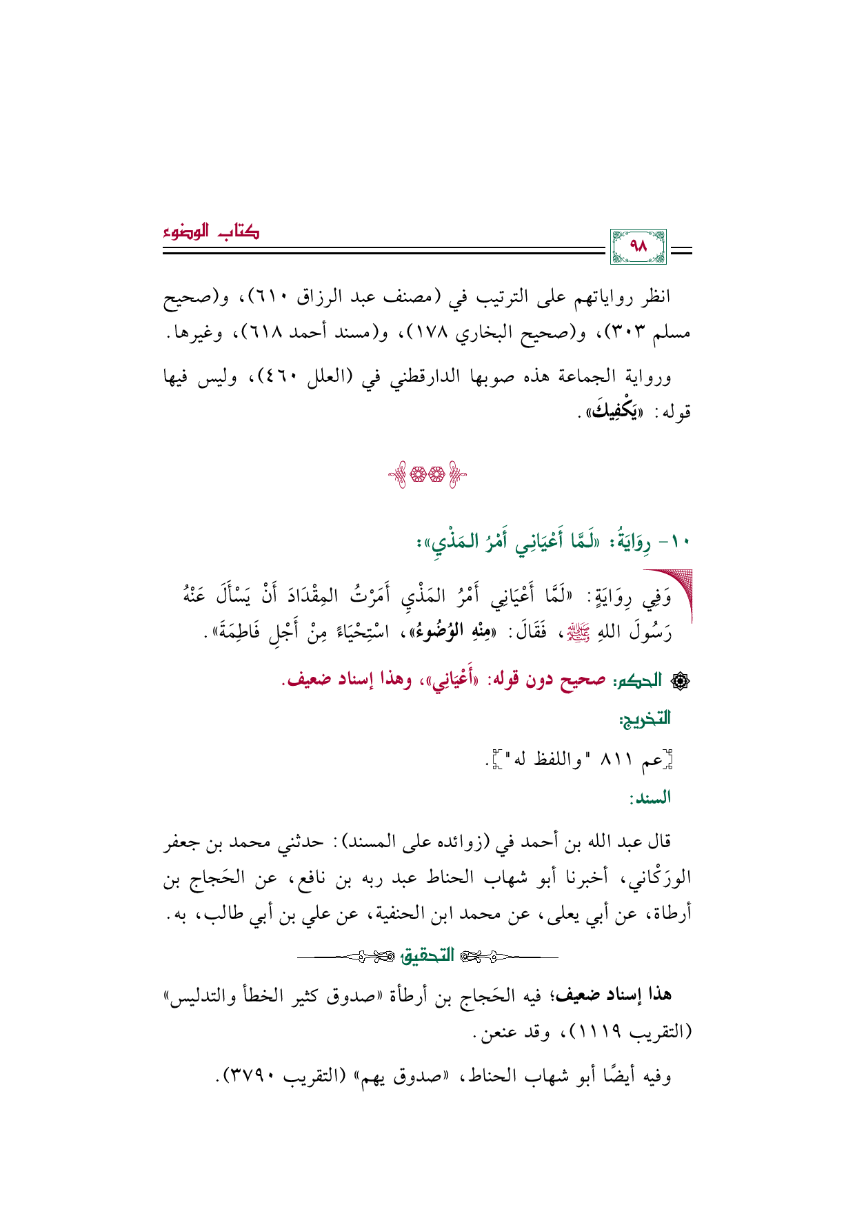 رِوَايَةُ: ((لَمَّا أَعْيَانِي أَمْرُ المَذْيِ)):
