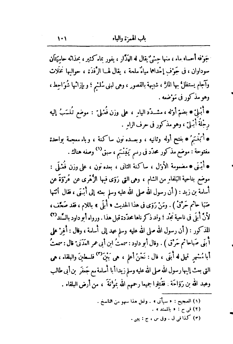 موضع بناحية البلقاء من الشام، وهى التى روى فيها الزّهرى عن عروة عن أسامة بن زيد: (أن رسول الله صلى الله عليه وسلم بعثه إلى أبنى، فقال ائتها صبا حاثم حرّق) . ومن روى فى هذا الحديث «أبلى» باللام، فقد صحّف، لأنّ أبلى فى ناحية نجد؛ وقد ذكرناها محدّدة قبل هذا. ورواه أبو داود بالسّند «2» المذكور: (أن رسول الله صلى الله عليه وسلم عهد إلى أسامة، وقال: أغر على أبنى صباحا ثم حرّق) . وقال أبو داود: سمعت ابن أبى عمر العدنىّ قال: سمعت أبا مسهر قيل له أبنى، قال: نحن أعلم، هى بين «3» فلسطين والبلقاء، هى التى بعث إليها رسول الله صلى الله عليه وسلم زيدا أبا أسامة مع جعفر بن أبى طالب وعبد الله بن رواحة. فقتلوا جميعا رحمهم الله بمؤتة، من أرض البلقاء.