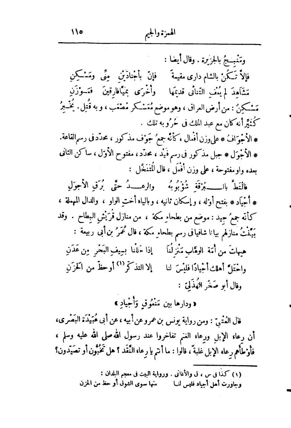 «ودارها بين منعوق وأجياد» قال العتبىّ: ومن رواية يونس بن عمرو عن أبيه، عن أبى عبيدة البصرى، أن رعاء الإبل ورعاء الغنم تفاخروا عند رسول الله صلى الله عليه وسلم، فأوطأهم رعاء الإبل غلبة، قالوا: ما أنتم يا رعاء النّقد؟ هل تخبّون أو تصيّدون؟