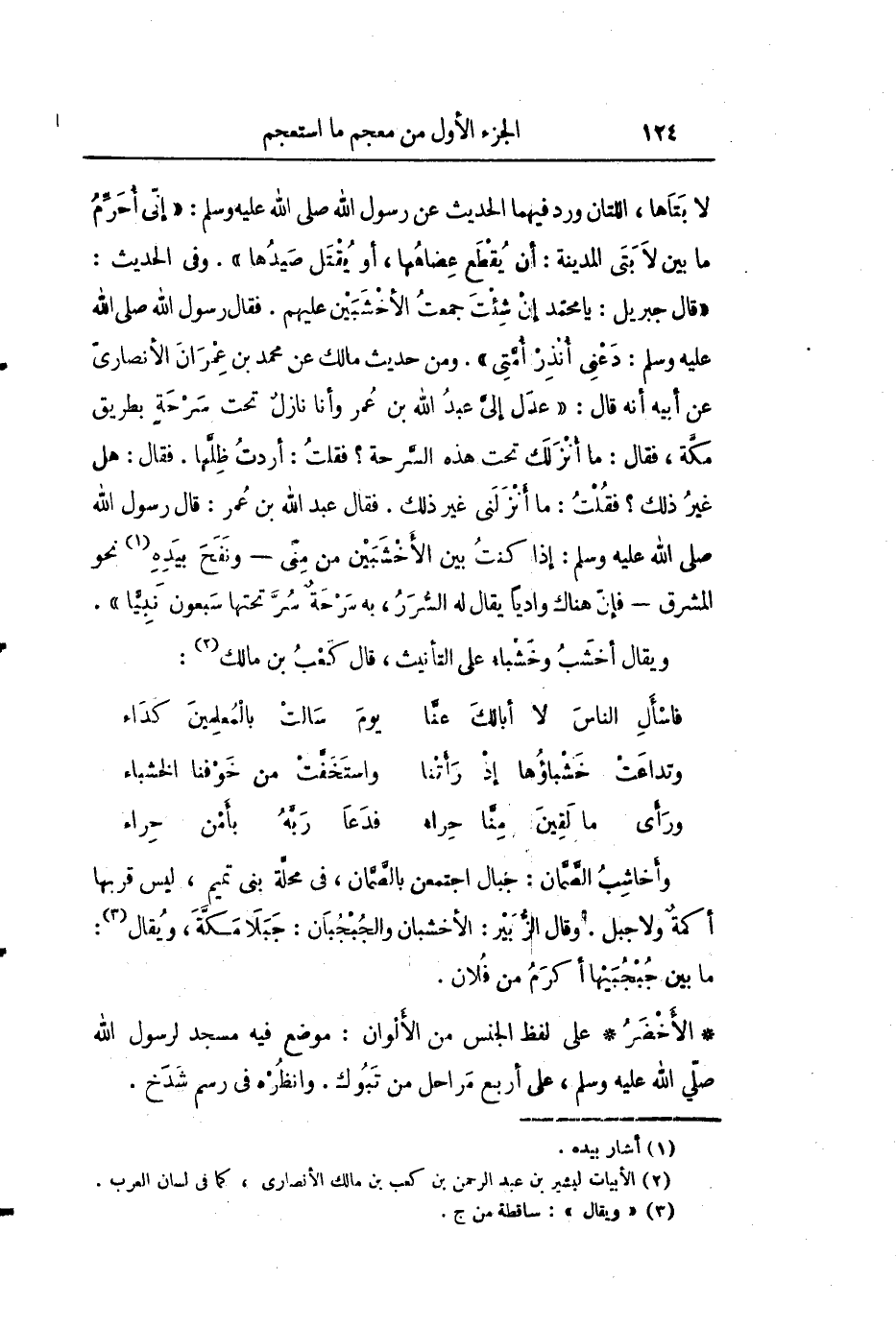 «قال جبريل: يا محمّد إن شئت جمعت الأخشبين عليهم. فقال رسول الله صلى الله عليه وسلم: دعنى أنذر أمّتى» . ومن حديث مالك عن محمد بن عمران الأنصارىّ عن أبيه أنه قال: «عدل إلىّ عبد الله بن عمر وأنا نازل تحت سرحة بطريق مكّة، فقال: ما أنزلك تحت هذه السّرحة؟ فقلت: أردت ظلّها. فقال: هل غير ذلك؟ فقلت: ما أنزلنى غير ذلك. فقال عبد الله بن عمر: قال رسول الله صلى الله عليه وسلم: إذا كنت بين الأخشبين من منّى- ونفح بيده «1» نحو المشرق- فإنّ هناك واديا يقال له السّرر، به سرحة سرّ تحتها سبعون نبيّا» .