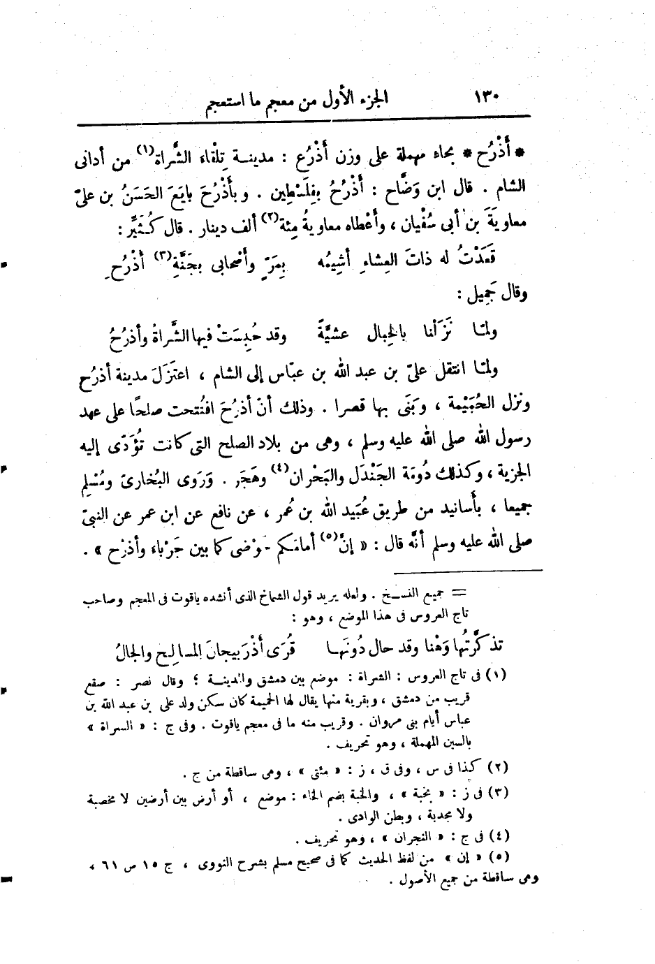 ولمّا انتقل علىّ بن عبد الله بن عبّاس إلى الشام، اعتزل مدينة أذرح ونزل الجميمة، وبنى بها قصرا. وذلك أنّ أذرح افتتحت صلحا على عهد رسول الله صلى الله عليه وسلم، وهى من بلاد الصلح التى كانت تؤدّى إليه الجزية، وكذلك دومة الجندل والبحران «4» وهجر. وروى البخارىّ ومسلم جميعا، بأسانيد من طريق عبيد الله بن عمر، عن نافع عن ابن عمر عن النّبيّ صلى الله عليه وسلم أنّه قال: «إنّ «5» أمامكم حوضى كما بين جرباء وأذرح» .