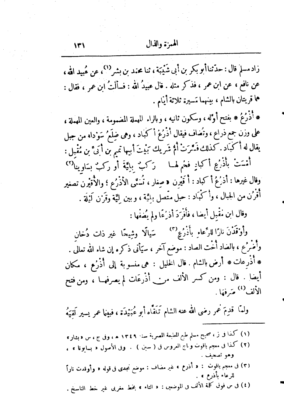 أرض بالشام. قال الخليل: هى منسوبة إلى أذرع، مكان أيضا. قال: ومن كسر الألف من أذرعات لم يصرفها، ومن فتح الألف «4» صرفها.