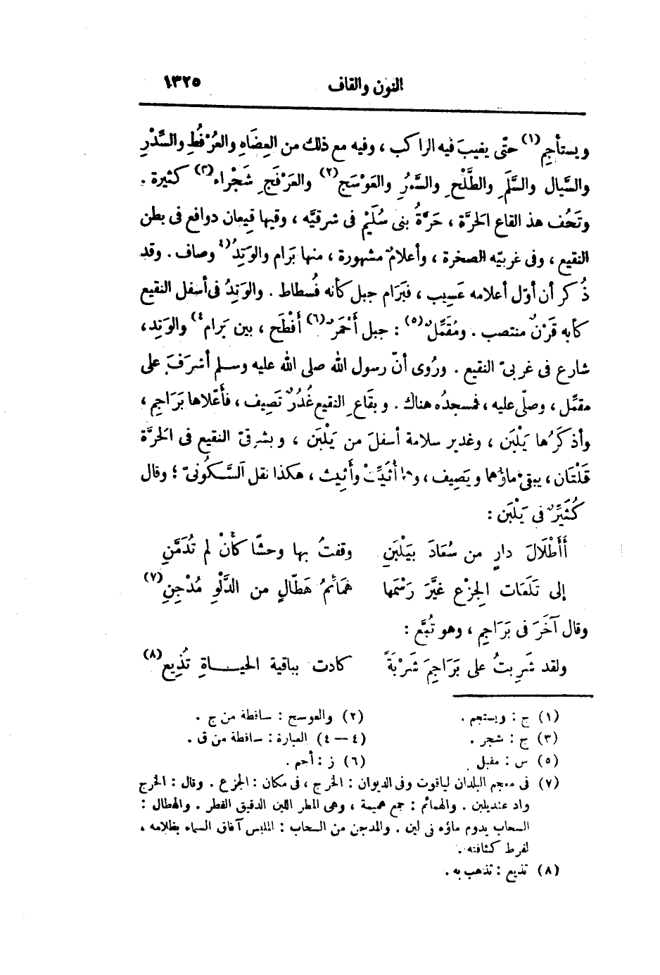 وتحف هذ القاع الحرّة، حرّة بنى سليم فى شرقيّه، وقيها قيعان دوافع فى بطن النقيع، وفى غربيّه الصخرة، وأعلام مشهورة، منها برام والوتد [وصاف. وقد ذكر أن أوّل أعلامه عسيب، فبرام جبل كأنه فسطاط. والوتد فى أسفل النقيع كأبه قرن منتصب. ومقمّل «4»