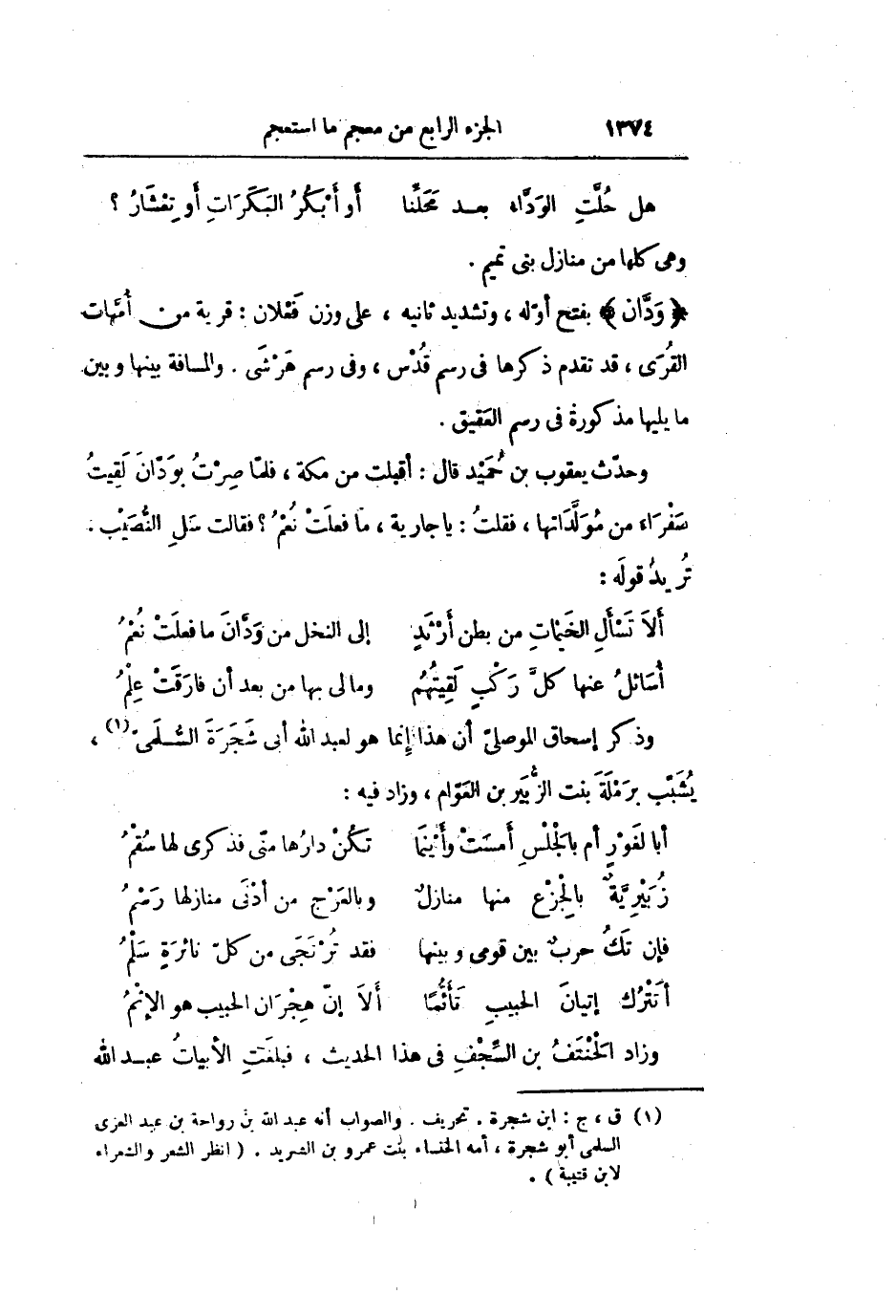 وحدّث يعقوب بن حميد قال: أقبلت من مكة، فلمّا صرت بودان لقيت صفراء من مولّداتها، فقلت: يا جارية، ما فعلت نعم؟ فقالت سل النّصيب.