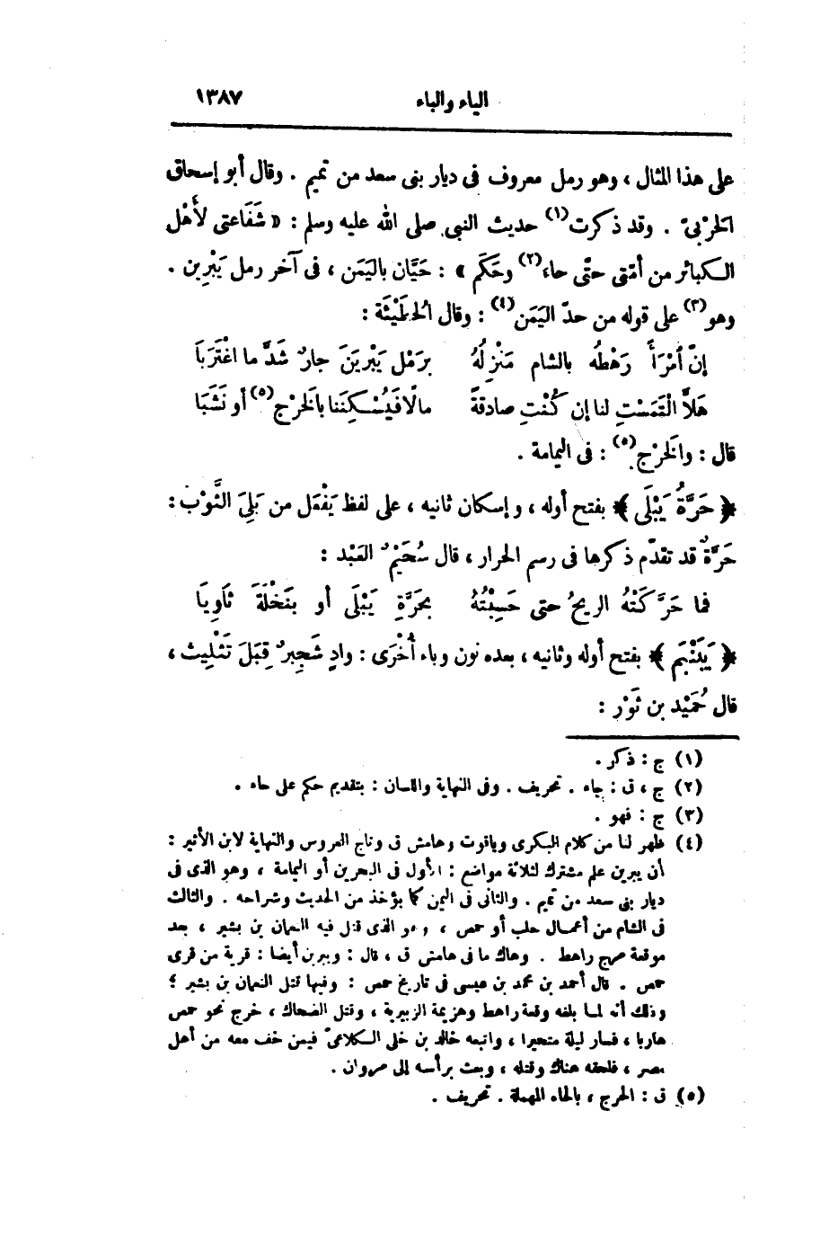 على هذا المثال، وهو رمل معروف فى ديار بنى سعد من تميم. وقال أبو إسحاق الحربىّ. وقد ذكرت «1» حديث النبي صلى الله عليه وسلم: «شفاعتى لأهل الكبائر من أمّتى حتّى حاء «2» وحكم» : حيّان باليمن، فى آخر رمل يبرين.