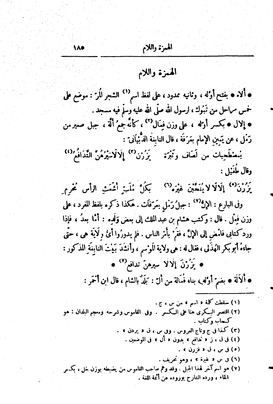 وفى البارع: الإلّ «7» : جبل رمل بعرفات. هكذا ذكره بلفظ المفرد، على وزن فعل. قال: وكتب هشام بن عبد الملك إلى بعض ولده: أمّا بعد، فإذا ورد كتابى فامض إلى الإلّ، فقم بأمر الناس. فلم يدوروا أىّ ولاية هى، حتّى جاءه أبو بكر الهذلى، فقال له: هى ولاية الموسم، وأنشد بيت النابغة المذكور: