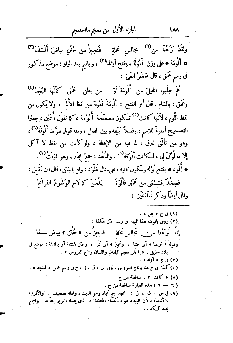 وعمق: بالشام. قال أبو الفتح: ألومة فعولة من لفظ الألم، ولا يكون من لفظ اللّوم، لأنّها كانت «5» تكون مصحّحة ألومة، كما تقول أعين، جعلوا التصحيح أمارة للاسم، وفصلا بينه وبين الفعل، ومنه قولهم للزّبد ألوقة «6» ، وهو من تألّق البرق، لما فيه من الإهالة، ولو كانت من لفظ لا آكل إلا ما لوّق لى، لكانت ألوقة «7» . والبجد: جمع بجاد، وهو البيت «8» .