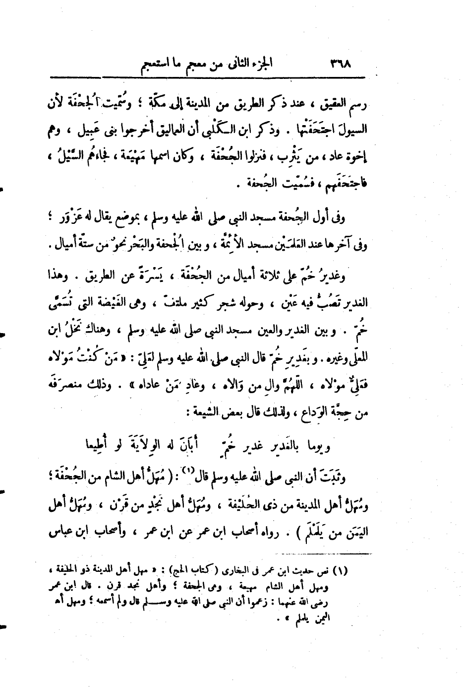 وغدير خمّ على ثلاثة أميال من الجحفة، يسرة عن الطريق. وهذا الغدير تصبّ فيه عين، وحوله شجر كثير ملتفّ، وهى الغيضة التى تسمّى خمّ. وبين الغدير والعين مسجد النبي صلى الله عليه وسلم، وهناك نخل ابن المعلّى وغيره. وبغدير خمّ قال النبي صلى الله عليه وسلم لعلىّ: «من كنت مولاه فعلىّ مولاه، اللهمّ وال من والاه، وعاد من عاداه» . وذلك منصرفه من حجّة الوداع، ولذلك قال بعض الشيعة: