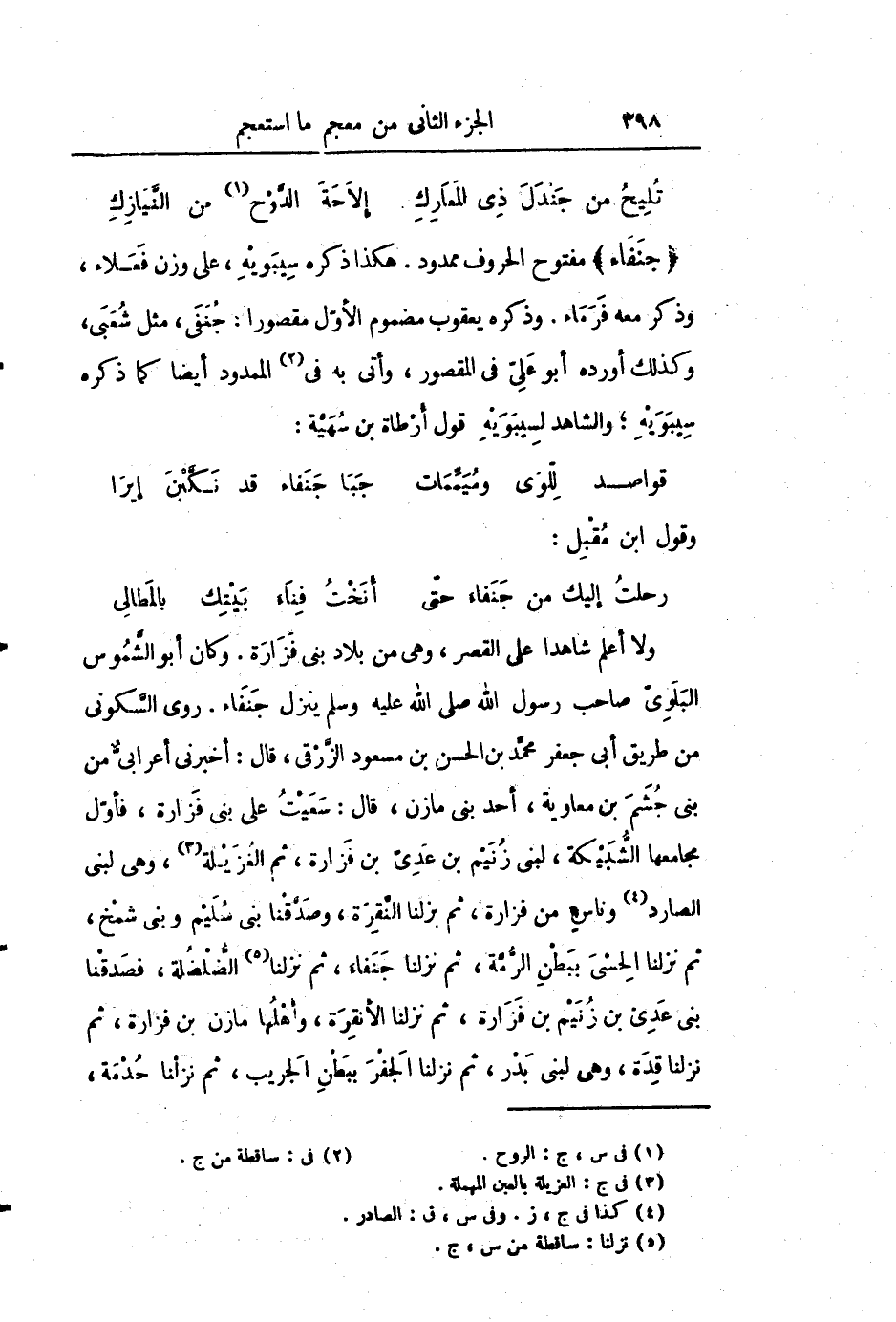 ولا أعلم شاهدا على القصر، وهى من بلاد بنى فزارة. وكان أبو الشّموس البلوىّ صاحب رسول الله صلى الله عليه وسلم ينزل جنفاء. روى السّكونى من طريق أبى جعفر محمّد بن الحسن بن مسعود الزّرقى، قال: أخبرنى أعرابىّ من بنى جشم بن معاوية، أحد بنى مازن، قال: سعيت على بنى فزارة، فأوّل مجامعها الشّبيكة، لبنى زنيم بن عدىّ بن فزارة، ثم الغزيلة «3» ، وهى لبنى الصارد «4» وناس من فزارة، ثم بزلنا النّقرة، وصدّقنا بنى سليم وبنى شمخ، ثم نزلنا الحسى ببطن الرّمّة، ثم نزلنا جنفاء، ثم نزلنا «5» الضّلضلة، فصدقنا بنى عدى بن زنيم بن فزارة، ثم نزلنا الأنقرة، وأهلها مازن بن فزارة، ثم نزلنا قدة، وهى لبنى بدر، ثم نزلنا الجفر ببطن الجريب، ثم نزلنا حدمة،