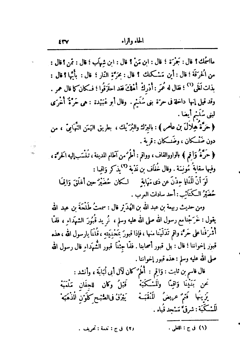 ومن حديث ربيعة بن عبد الله بن الهدير قال: سمعت طلحة بن عبد الله يقول: خرجنا مع رسول الله صلى الله عليه وسلم، نريد قبور الشهداء، فلمّا أشرفنا على حرّة واقم تدلّينا منها، فإذا قبور بمحنيته، قلنا يا رسول الله، هذه قبور إخواننا؛ قال: بل قبور أصحابنا. فلمّا جئنا قبور الشّهداء قال رسول الله صلى الله عليه وسلم: هذه قبور إخواننا.