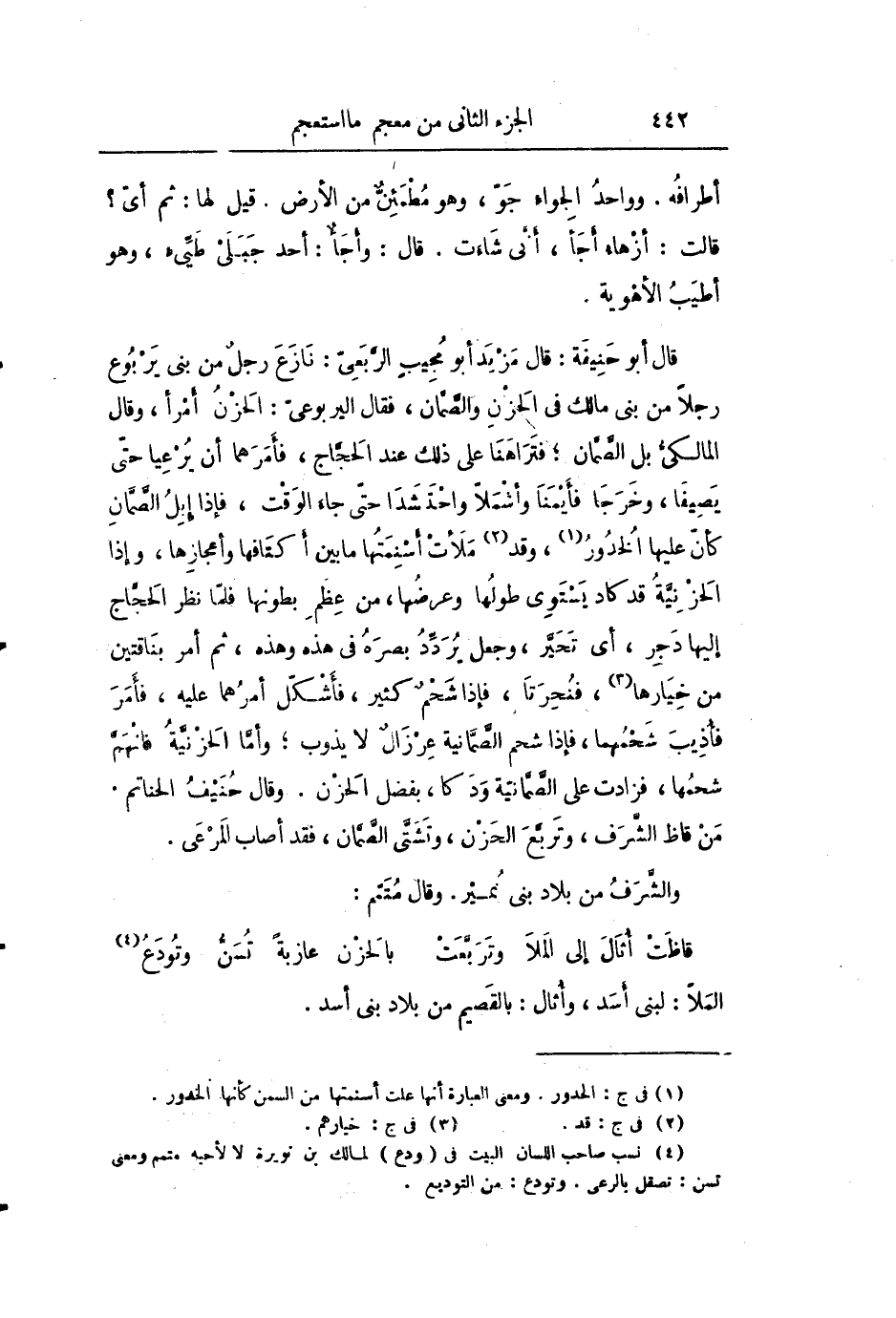 قال أبو حنيفة: قال مزيد أبو مجيب الرّبعىّ: نازع رجل من بنى يربوع رجلا من بنى مالك فى الحزن والصّمان، فقال اليربوعىّ: الحزن امرأ، وقال المالكىّ بل الصّمّان؛ فتراهنا على ذلك عند الحجّاج، فأمرهما أن يرعيا حتّى يصيفا، وخرجا فأيمنا وأشملّا واحتشدا حتّى جاء الوقت، فإذا إبل الصّمّان كأنّ عليها الخدور «1» ، وقد «2» ملأت أسنمتها ما بين أكتافها وأعجازها، وإذا الحزنيّة قد كاد يستوى طولها وعرضها، من عظم بطونها فلمّا نظر الحجّاج إليها دجر، أى تحيّر، وجعل يردّد بصره فى هذه وهذه، ثم أمر بناقتين من خيارها «3» ، فنحرتا، فإذا شحم كثير، فأشكّل أمرهما عليه، فأمر فأذيب شحمهما، فإذا شحم الصّمّانية عرزال لا يذوب؛ وأمّا الحزنيّة فانهمّ شحمها، فزادت على الصّمّانيّة ودكا، بفضل الحزن. وقال حنيف الحناتم.