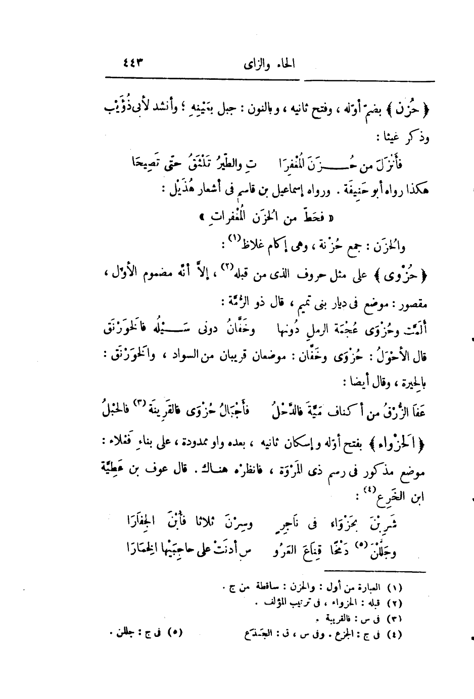 «فحطّ من الحزن المغفرات» والحزن: جمع حزنة، وهى إكام غلاظ «1» :