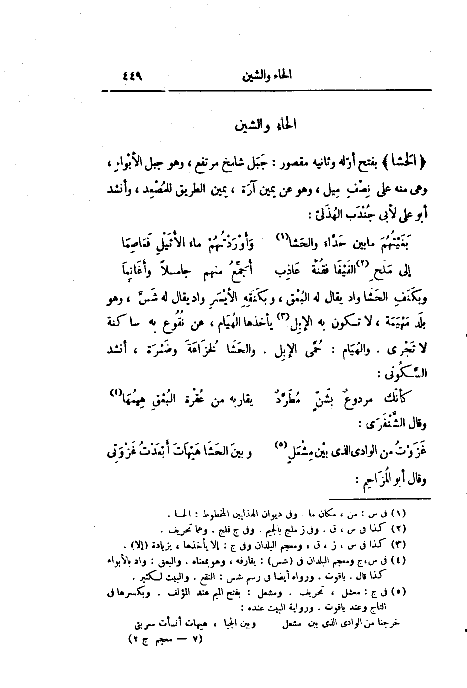 وبكنف الحشا واد يقال له البعق، وبكنقه الأيسر واد يقال له شسّ، وهو بلد مهيمة، لا تكون به الإبل. «3» يأخذها الهيام، عن نقوع به ساكنة لا تجرى. والهيام: حمّى الإبل. والحشا لخزاعة وضمرة، أنشد السّكونى: