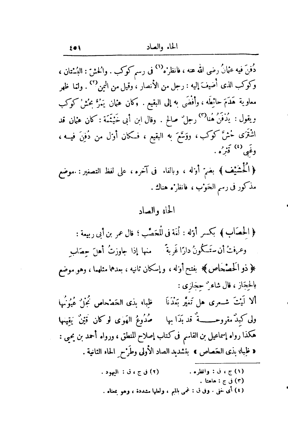 دفن فيه عثمان رضى الله عنه، فانظره «1» فى رسم كوكب. والحشّ: البستان، وكوكب الذي أضيف إليه: رجل من الأنصار، وقيل من اليمن «2» . ولمّا ظهر معاوية هدم حائطه، وأفضى به إلى البقيع. وكان عثمان يمرّ بحشّ كوكب ويقول: يدفن هنا «3» رجل صالح. وقال ابن أبى خيثمة: كان عثمان قد اشترى حشّ كوكب، ووسّع به البقيع، فكان أوّل من دفن فيه، وغبى «4» قبره.