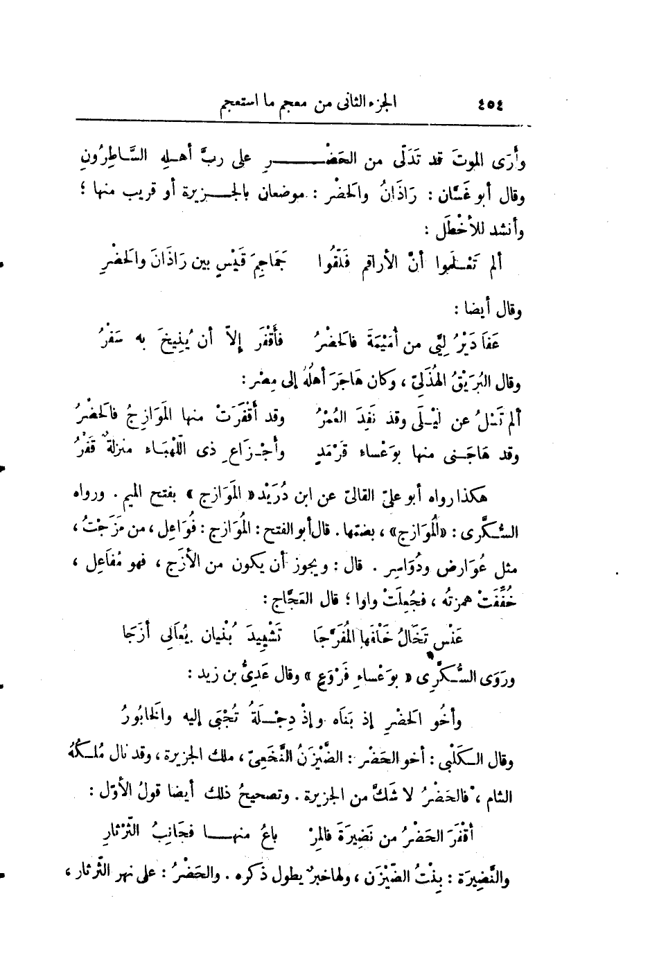 وأخو الحضر إذ بناه وإذ دجلة تجبى إليه والخابور وقال الكلبى: أخو الحضر: الضّيزن النّخعىّ، ملك الجزيرة، وقد نال ملكه الشام، فالحضر لا شكّ من الجزيرة. وتصحيح ذلك أيضا قول الأوّل: