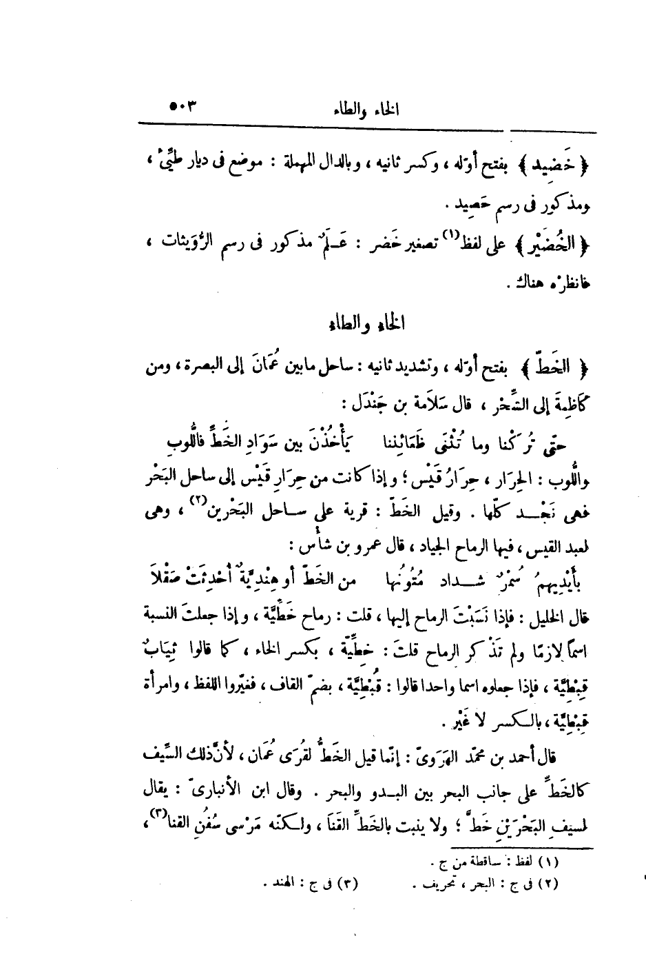 قال أحمد بن محمّد الهروىّ: إنّما قيل الخطّ لقرى عمان، لأنّ ذلك السّيف كالخطّ على جانب البحر بين البدو والبحر. وقال ابن الأنبارىّ: يقال لسيف البحرين خطّ؛ ولا ينبت بالخطّ القنا، ولكنّه مرسى سفن القنا «3» ،