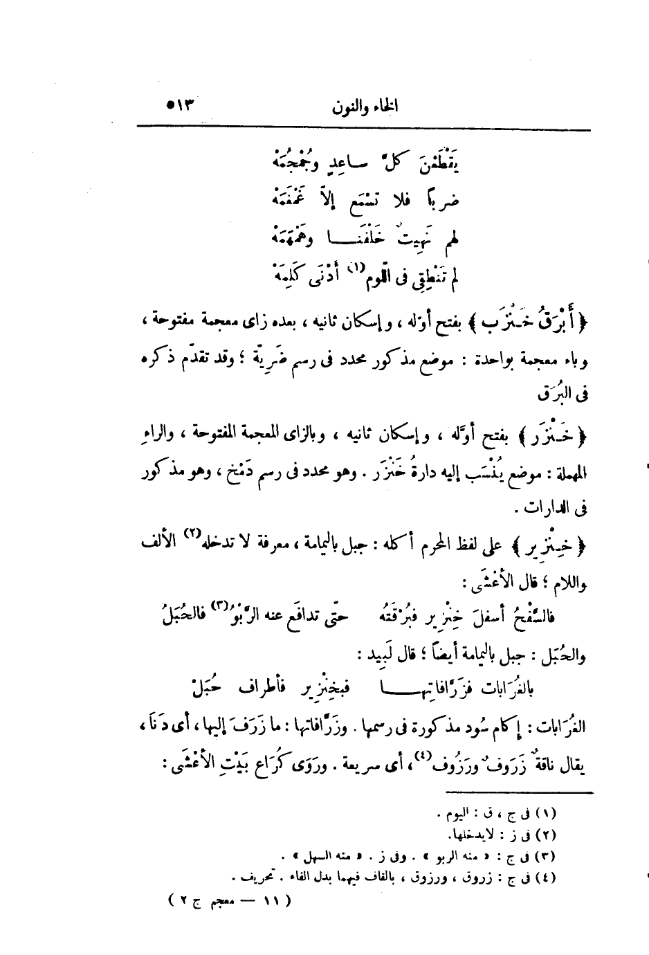 بفتح أوّله، وإسكان ثانيه، وبالزاى المعجمة المفتوحة، والراء المهملة: موضع ينسب إليه دارة خنزر. وهو محدد فى رسم دمخ، وهو مذكور فى الدارات.