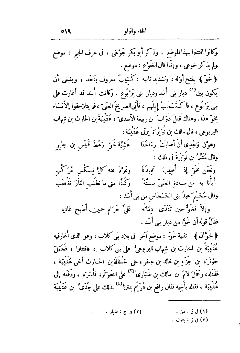 تثنية خوّ: موضع آخر فى بلاد بنى كلاب، وهو الذي أغار فيه عتيبة بن الحارث بن شهاب اليربوعىّ على بنى كلاب، فاقتتلوا، فحمل حوثرة بن جزء بن خالد بن جعفر، على حنظلة بن الحارث أخى عتيبة، فقتله، وحمل لام بن مالك بن ضبارىّ «2» على الخوثرة فأسره، ودفعه إلى عتيبة، فقتله بأخيه فقال رافع بن هريم يمتنّ «3» بذلك على جدىّ بن عتيبة