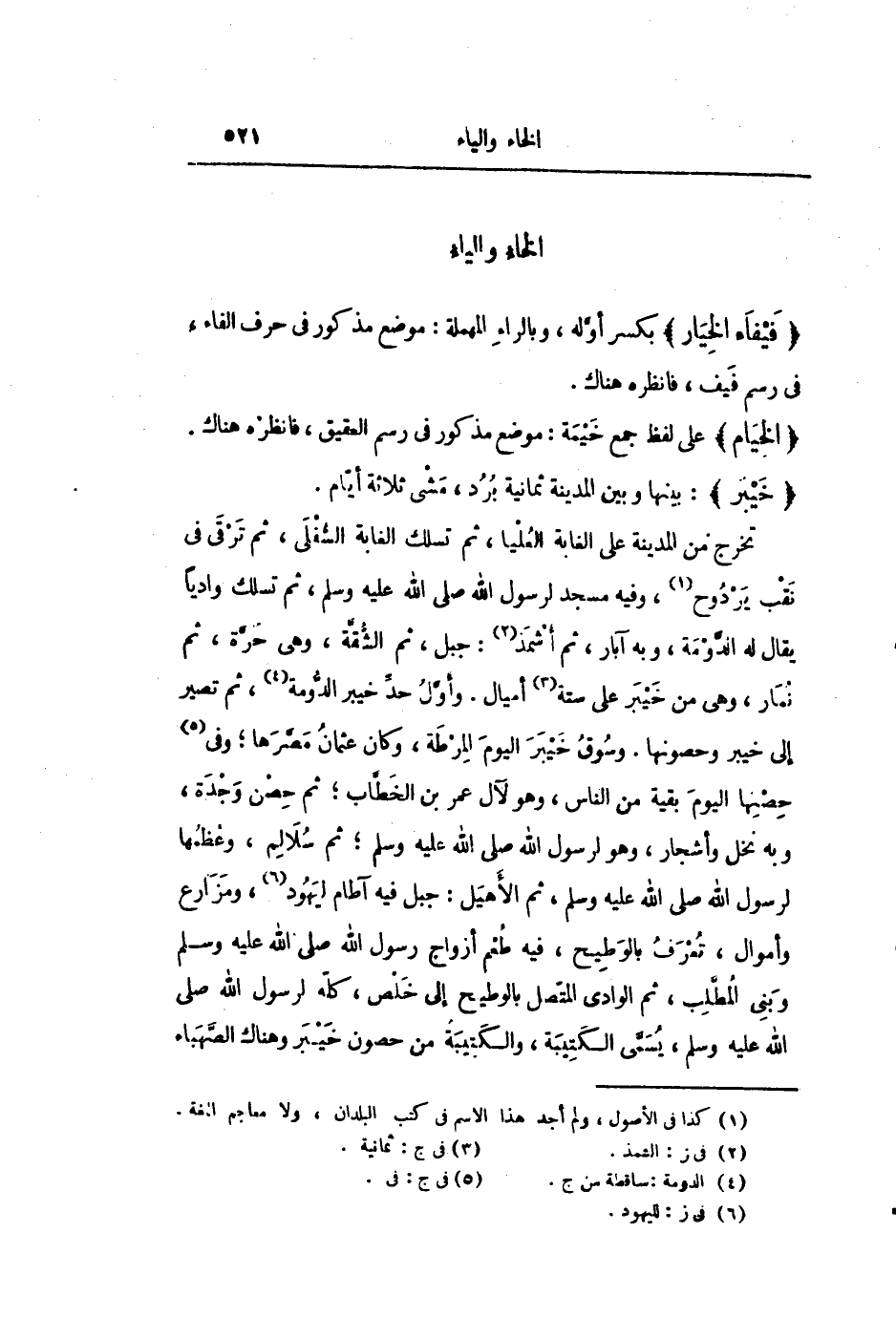 تخرج من المدينة على الغابة العليا، ثم تسلك الغابة السّفلى، ثم ترقى فى نقب يردوح «1» ، وفيه مسجد لرسول الله صلى الله عليه وسلم، ثم تسلك واديا يقال له الدّومة، وبه آبار، ثم أشمذ «2» : جبل، ثم الشّقّة، وهى حرّة، ثم نمار، وهى من خيبر على ستة «3» أميال. وأوّل حدّ خيبر الدّومة «4» ، ثم تصير إلى خيبر وحصونها. وسوق خيبر اليوم المرطة، وكان عثمان مصّرها؛ وفى «5» حصنها اليوم بقية من الناس، وهو لآل عمر بن الخطّاب؛ ثم حصن وجدة، وبه نخل وأشجار، وهو لرسول الله صلى الله عليه وسلم؛ ثم سلالم، وعظمها لرسول الله صلى الله عليه وسلم، ثم الأهيل: جبل فيه آطام ليهود «6» ، ومزارع وأموال، تعرف بالوطيح، فيه طعم أزواج رسول الله صلى الله عليه وسلم وبنى المطّلب، ثم الوادى المتّصل بالوطيح إلى خلص، كلّه لرسول الله صلى الله عليه وسلم، يسمّى الكتيبة، والكتيبة من حصون خيبر وهناك الصّهباء