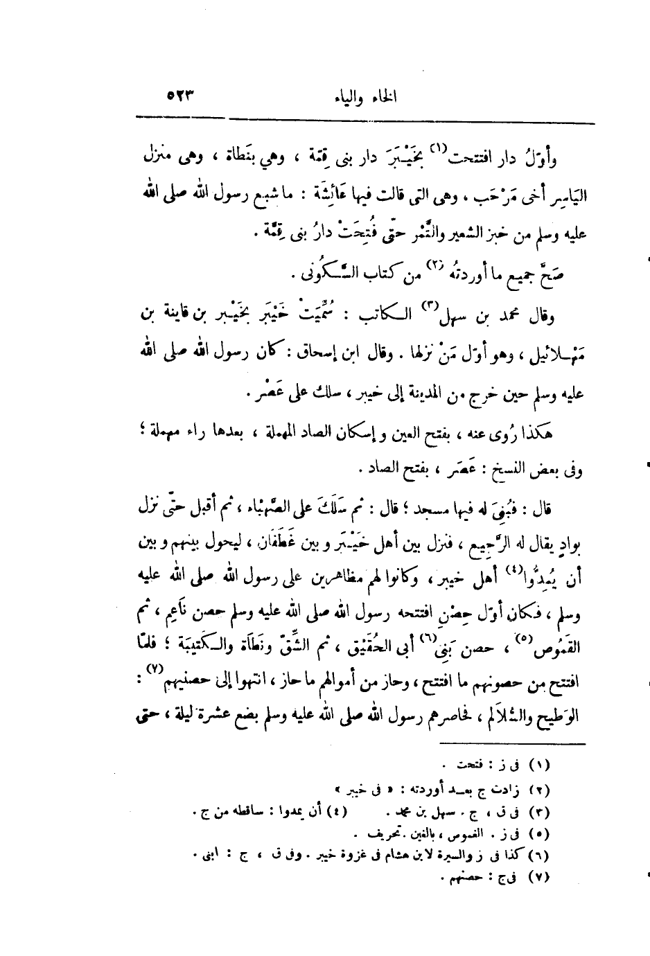 قال: فبنى له فيها مسجد؛ قال: ثم سلك على الصّهباء، ثم أقبل حتّى نزل بواد يقال له الرّجيع، فنزل بين أهل خيبر وبين غطفان، ليحول بينهم وبين أن يمدّوا «4» أهل خيبر، وكانوا لهم مظاهرين على رسول الله صلى الله عليه وسلم، فكان أوّل حصن افتتحه رسول الله صلى الله عليه وسلم حصن ناعم، ثم القموص «5» ، حصن بنى «6» أبى الحقيق، ثم الشّقّ ونطاة والكتيبة؛ فلمّا افتتح من حصونهم ما افتتح، وحاز من أموالهم ما حاز، انتهوا إلى حصنيهم «7» :