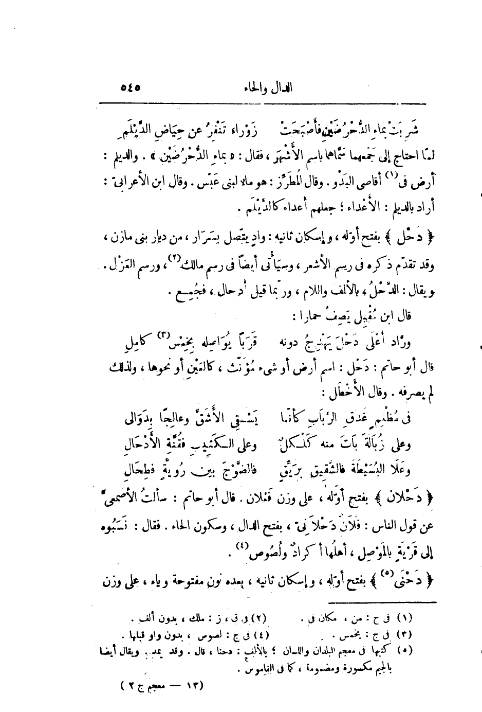 قال أبو حاتم: دحل: اسم أرض أو شىء مؤنّث، كالعين أو نحوها، ولذلك لم يصرفه. وقال الأخطل: