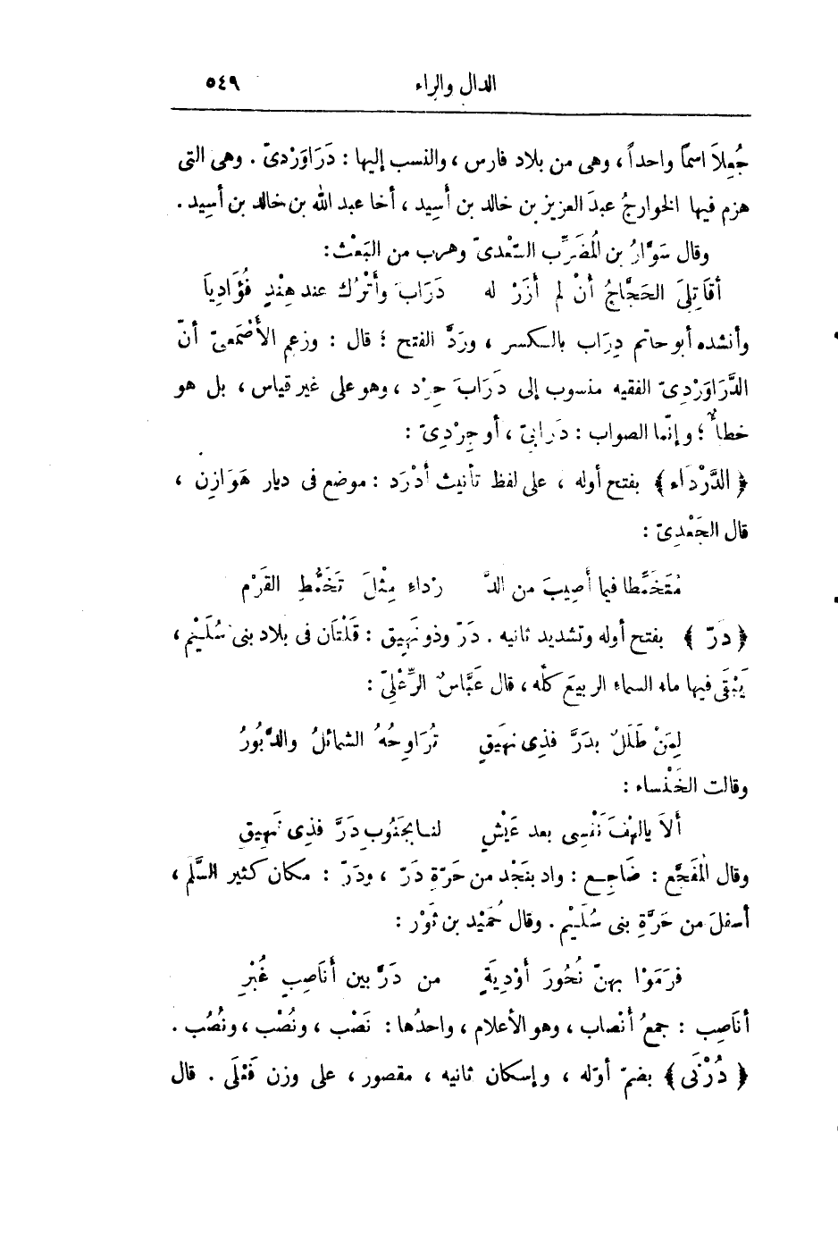 وأنشده أبو حاتم دراب بالكسر، وردّ الفتح؛ قال: وزعم الأصمعىّ أنّ الدّراوردىّ الفقيه منسوب إلى دراب حرد، وهو على غير قياس، بل هو خطأ؛ وإنّما الصواب: درابىّ، أو جردىّ: