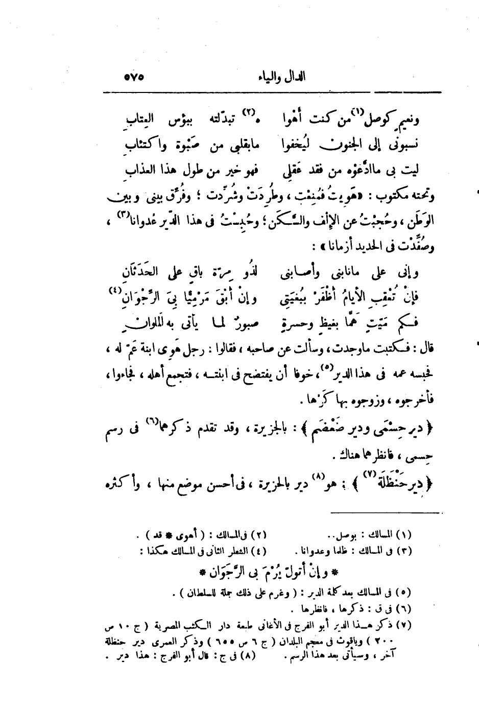 قال: فكتبت ما وجدت، وسألت عن صاحبه، فقالوا: رجل هوى ابنة عمّ له، فحبسه عمه فى هذا الدير «5» ، خوفا أن يفتضح فى ابنته، فتجمع أهله، فجاءوا، فأخرجوه، وزوجوه بها كرها.