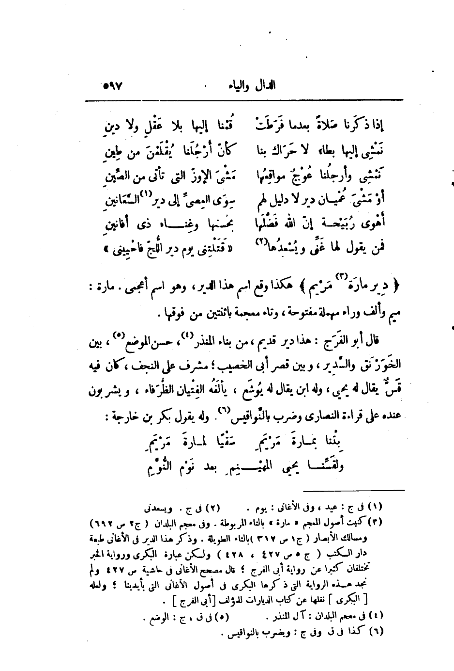 قال أبو الفرج: هذا دير قديم، من بناء المنذر «4» ، حسن الموضع «5» ، بين الخورنق والسّدير، وبين قصر أبى الخصيب؛ مشرف على النجف، كان فيه قسّ يقال له يحيى، وله ابن يقال له يوشع، يألفه الفتيان الظّرفاء، ويشربون عنده على قراءة النصارى وضرب بالنّواقيس «6» . وله يقول بكر بن خارجة: