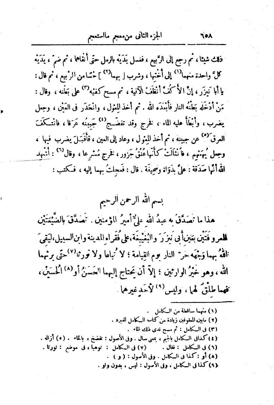 بسم الله الرّحمن الرّحيم هذا ما تصدّق به عبد الله علىّ أمير المؤمنين. تصدّق بالضّيعتين المعروفتين بعين أبى نيزر والبغيبغة، على فقراء المدينة وابن السبيل، ليقى الله بهما وجهه حرّ النار يوم القيامة؛ لا تباعا ولا تورثا «7» حتّى يرثهما الله، وهو خير الوارثين؛ إلّا أن يحتاج إليهما الحسن أو «8» الحسين، فهما طلق لهما، وليس «9» لأحد غيرهما.