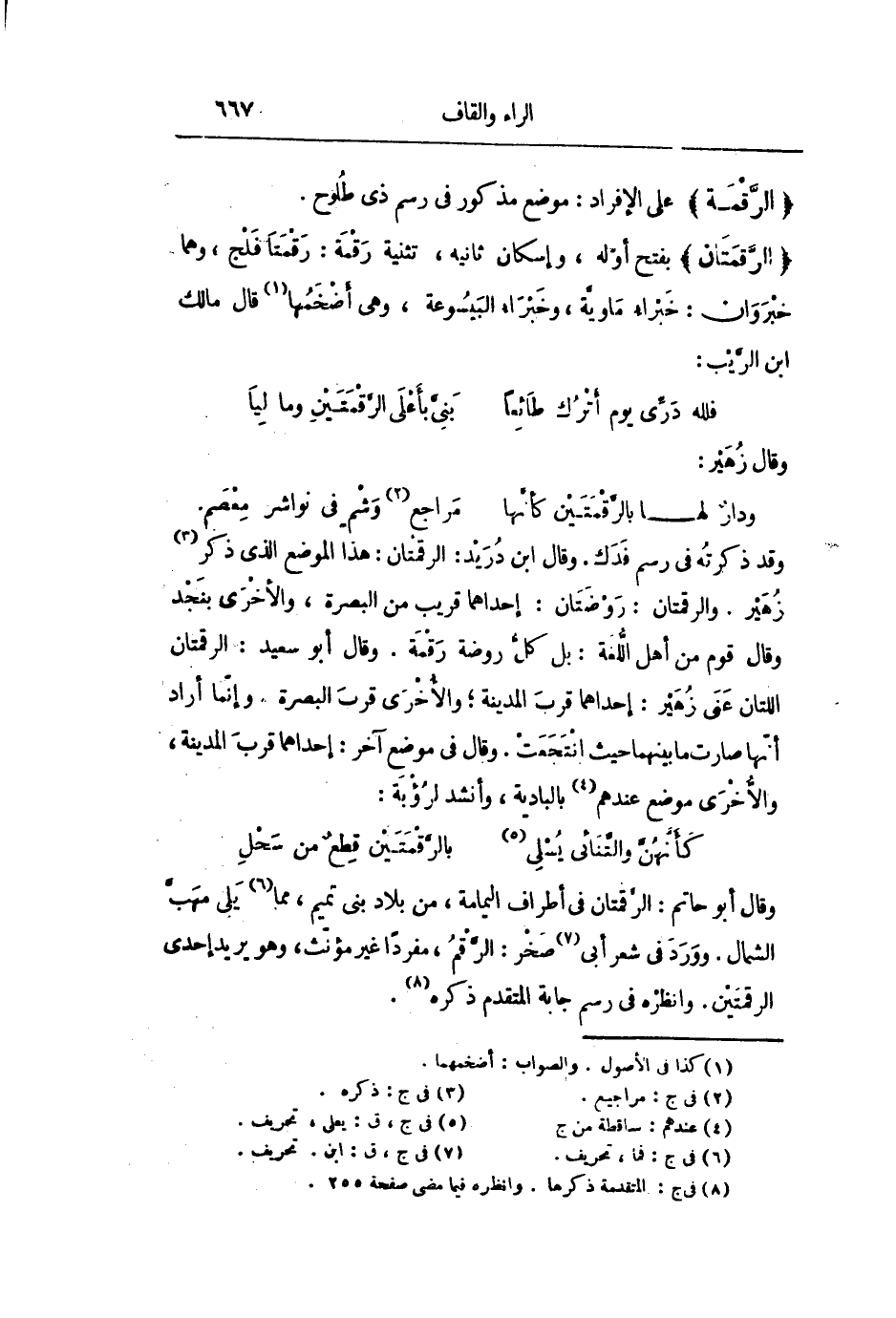 وقال أبو حاتم: الرّقمتان فى أطراف اليمامة، من بلاد بنى تميم، مما «6» يلى مهبّ الشمال. وورد فى شعر أبى «7» صخر: الرّقم، مفردا غير مؤنّث، وهو يريد إحدى الرقمتين. وانظره فى رسم جابة المتقدم ذكره «8» .